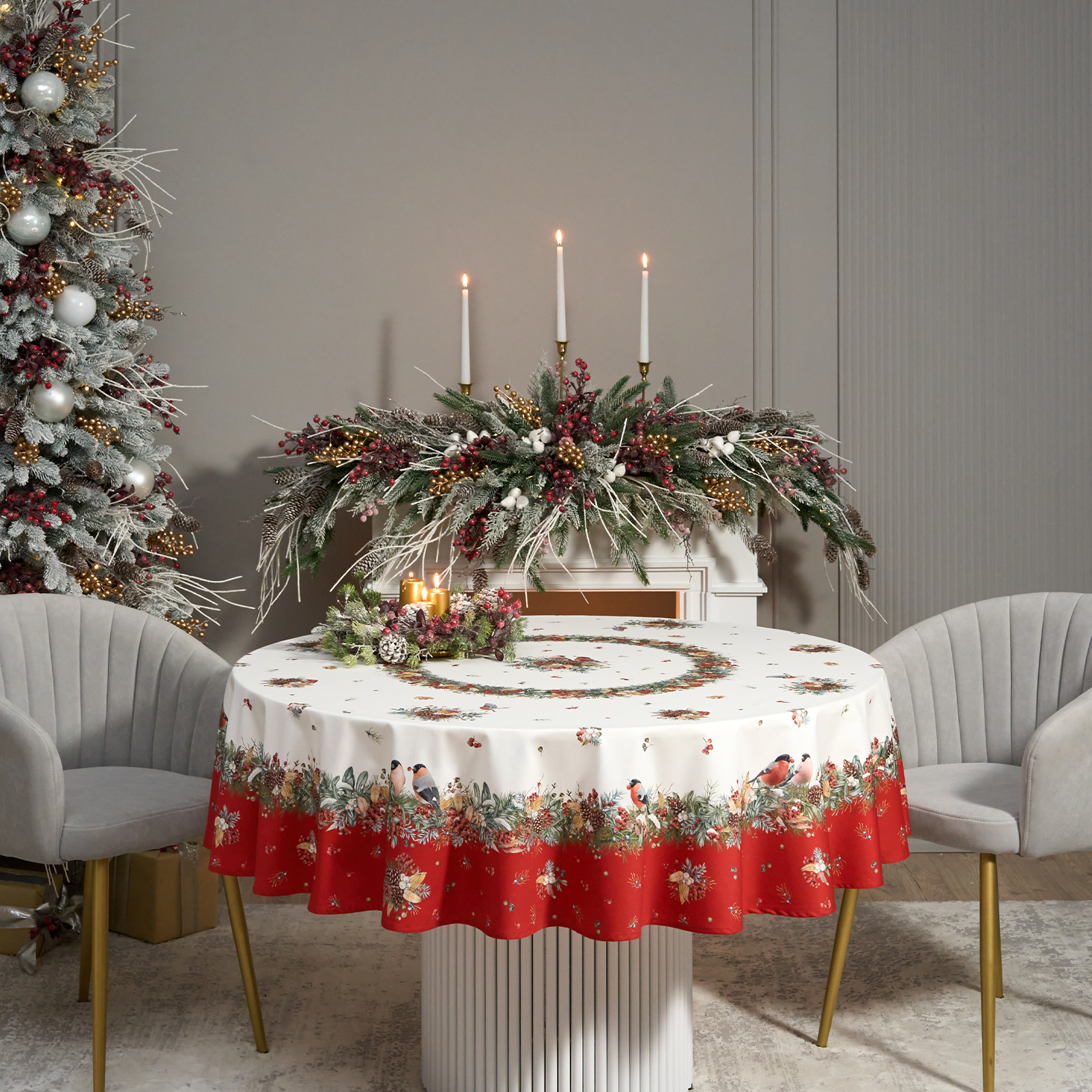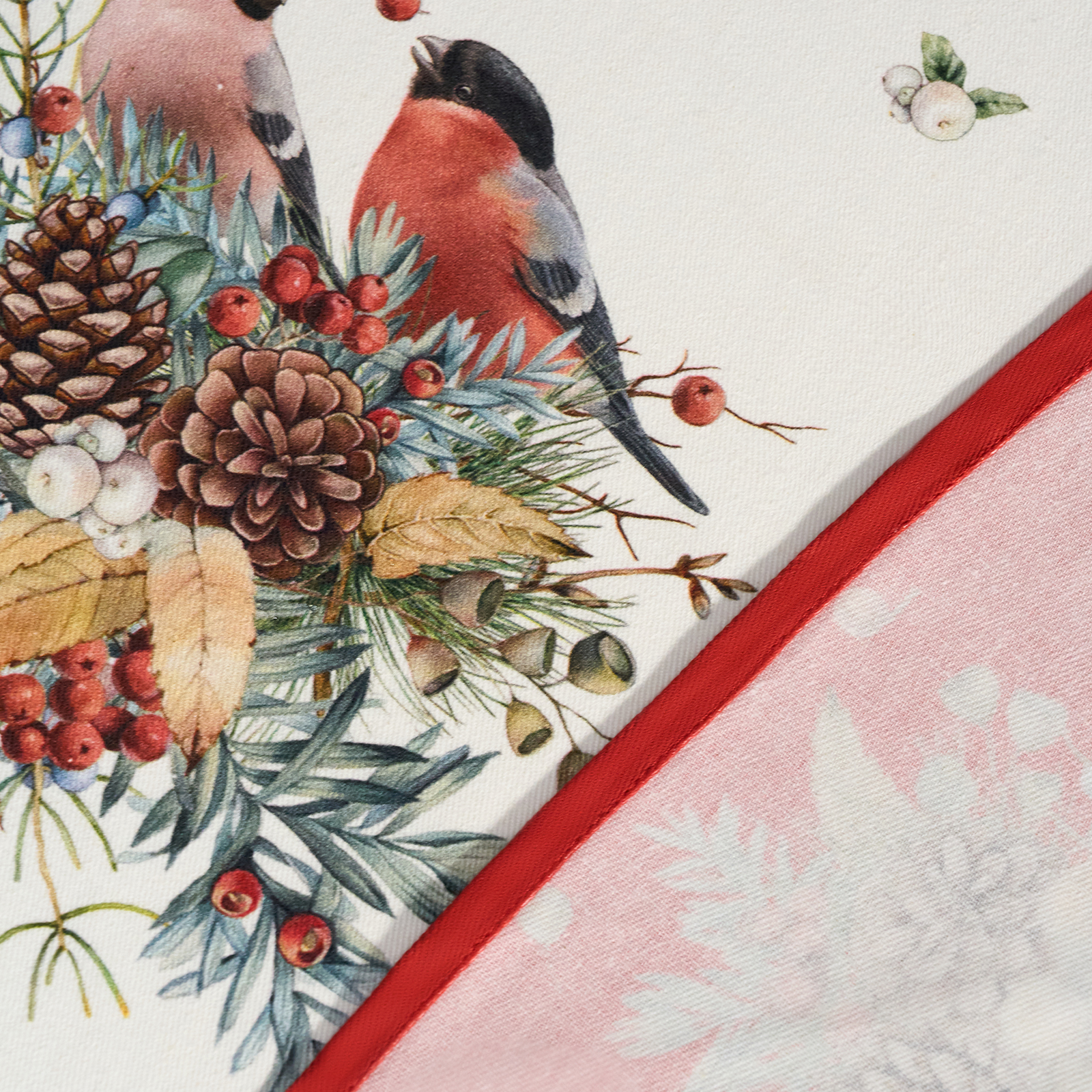 СКАТЕРТЬ КРУГЛАЯ "МОРОЗКО.СНЕГИРИ" 190СМ ,КРАСНЫЙ, 100% ХЛОПОК, ТВИЛ, С ПРОПИТКОЙ