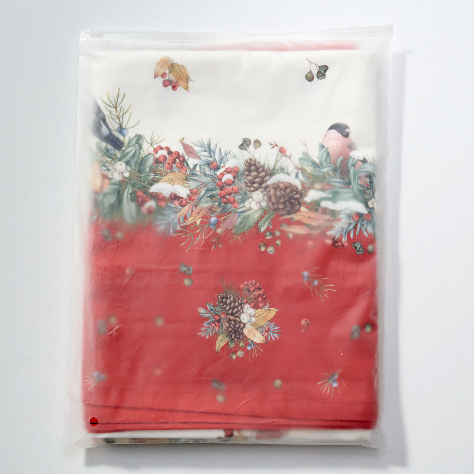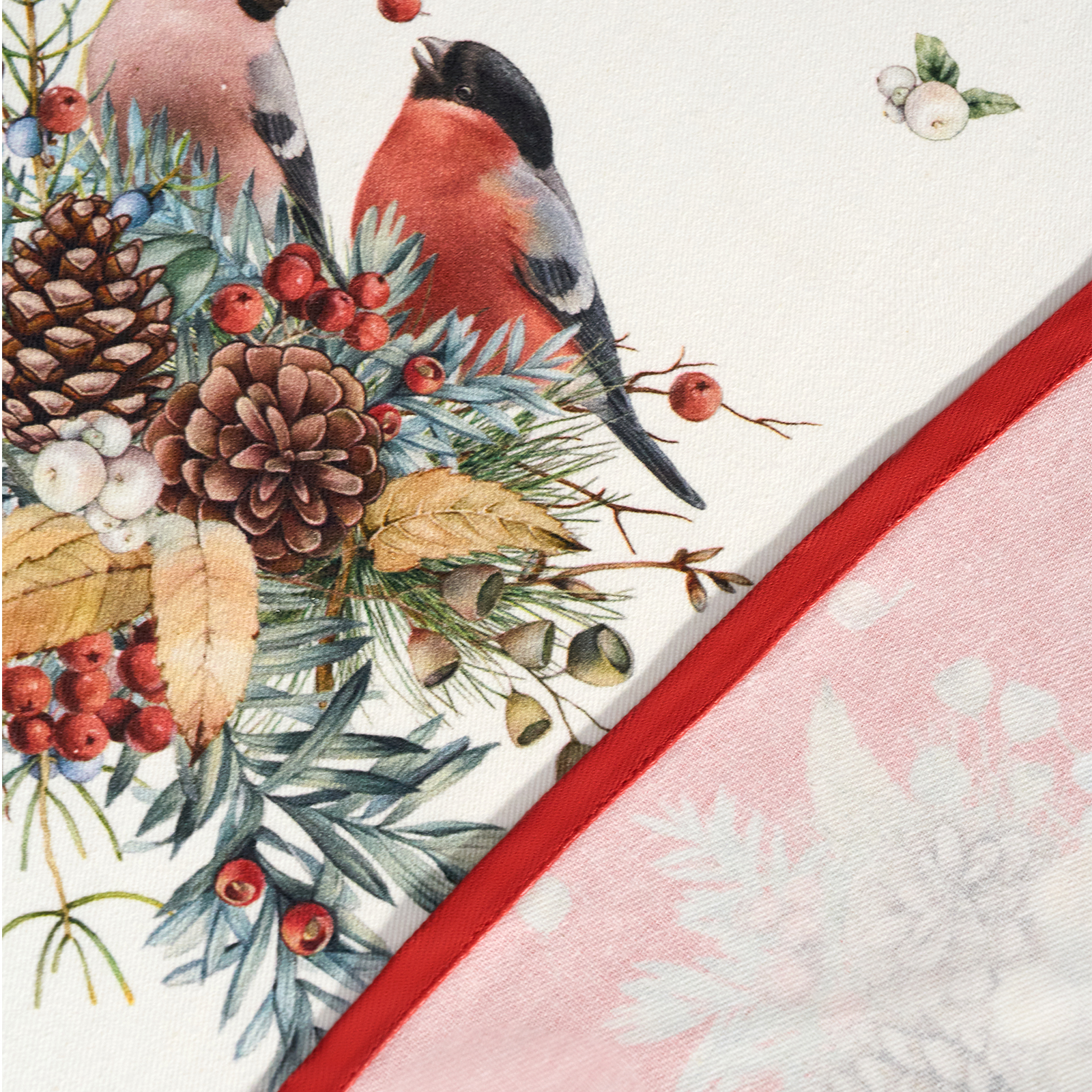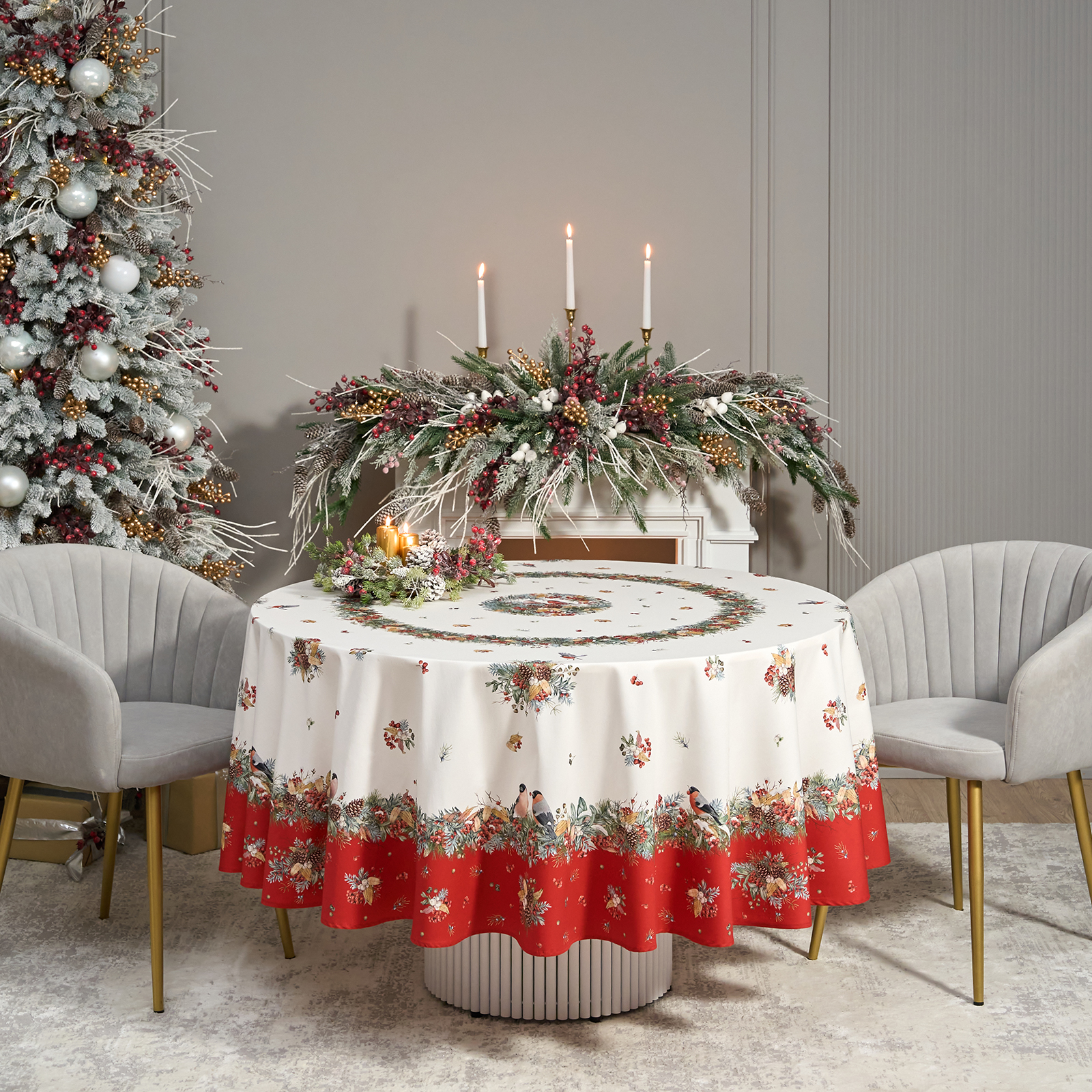 СКАТЕРТЬ КРУГЛАЯ "МОРОЗКО.СНЕГИРИ" 220СМ ,КРАСНЫЙ, 100% ХЛОПОК, ТВИЛ, С ПРОПИТКОЙ
