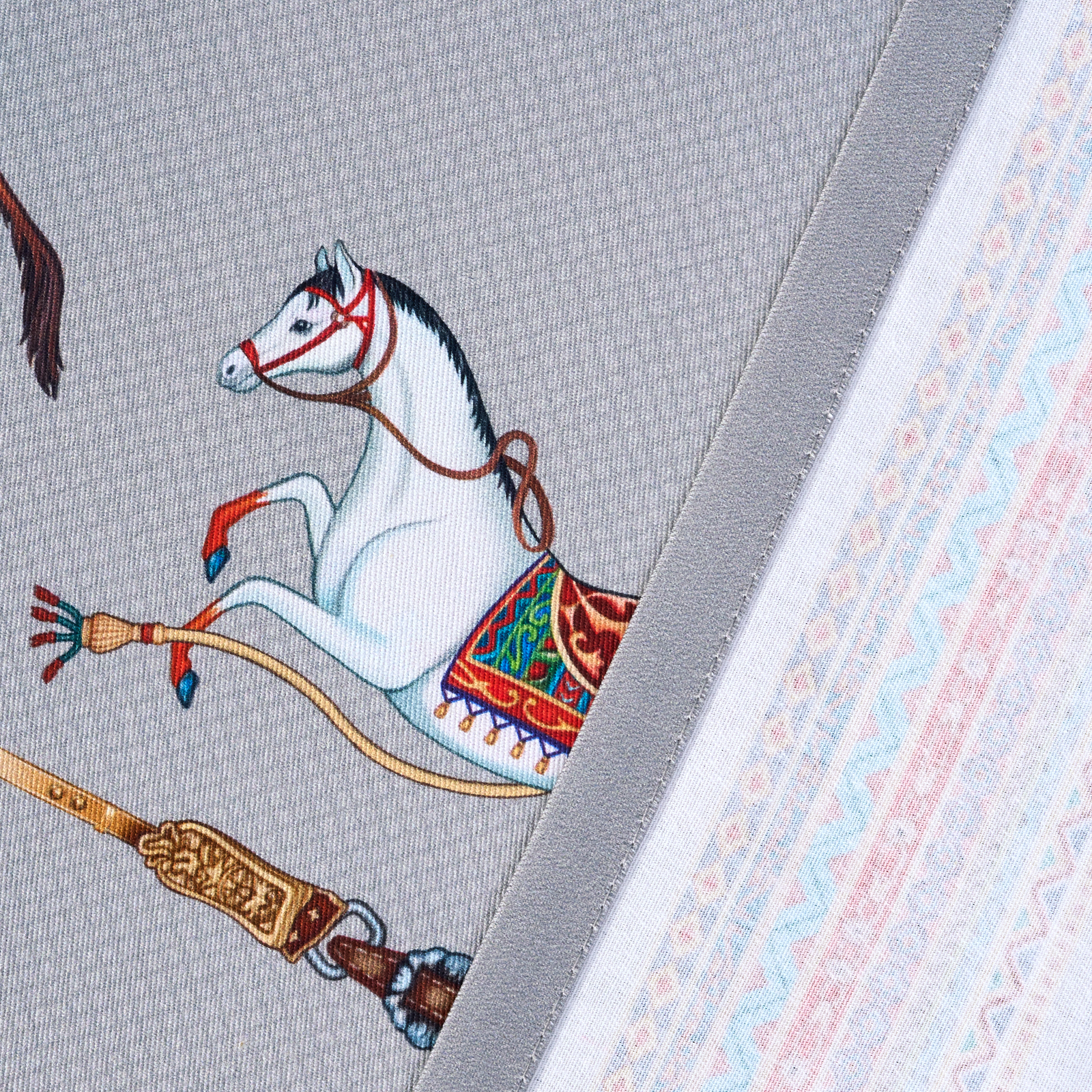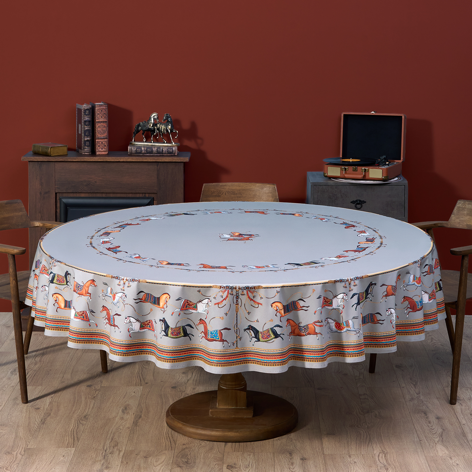Фон украшен авторским орнаментом с изящными лошадьми — символом 2026 года. Такой принт делает скатерть особенно уместной для праздничной сервировки и стильным украшением интерьера. Рисунок разработан художниками Lefard и нанесён методом цифровой печати, что обеспечивает стойкость красок даже после множества стирок.