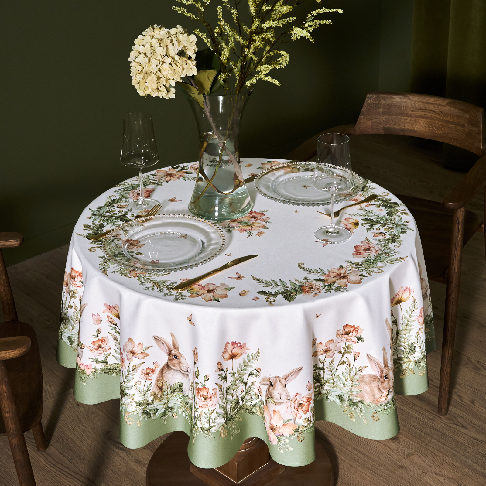 Принт с милыми кроликами, нежными зелёными оттенками и природными мотивами делает изделие выразительным элементом декора, благодаря которому стол становится центром внимания. Он создаёт атмосферу уюта и гармонии на кухне, даче или в гостиной