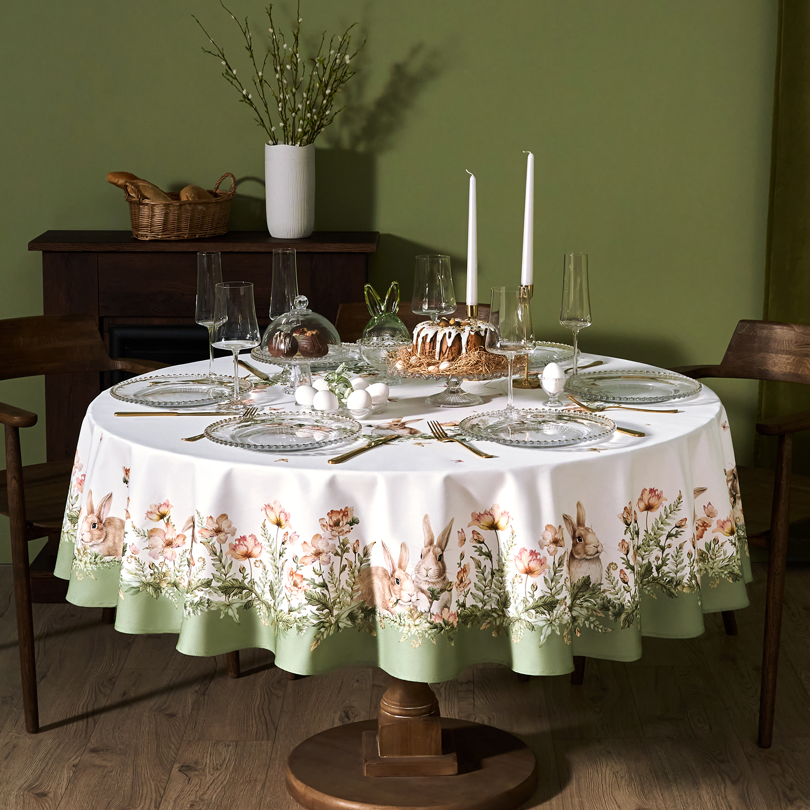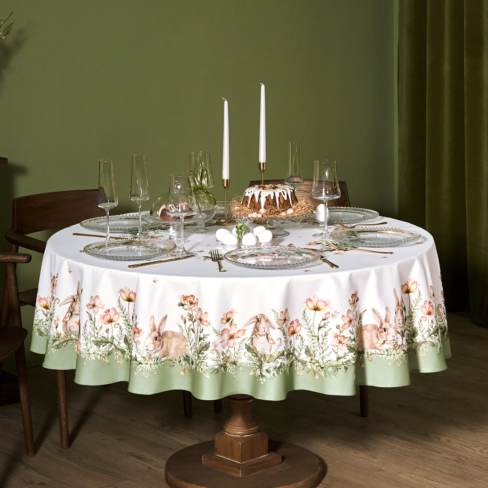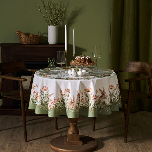 Принт с милыми кроликами, нежными зелёными оттенками и природными мотивами делает изделие выразительным элементом декора, благодаря которому стол становится центром внимания. Он создаёт атмосферу уюта и гармонии на кухне, даче или в гостиной
