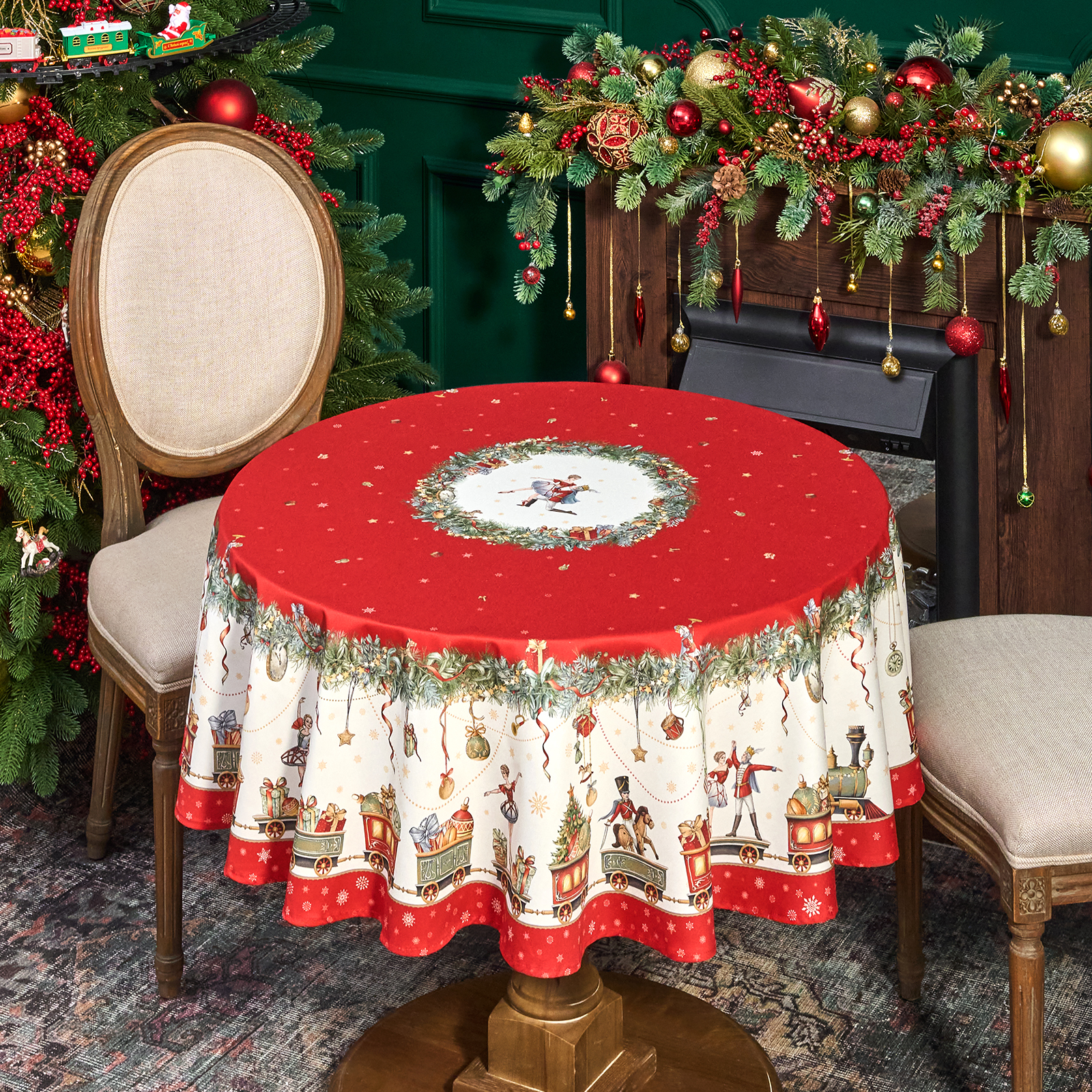 Круглая новогодняя скатерть Lefard «Щелкунчик» диаметр 150 см — элегантное украшение стола и элемент рождественского декора дома. Подходит для круглых столов диаметром 70–100 см, создавая аккуратный равномерный свес.