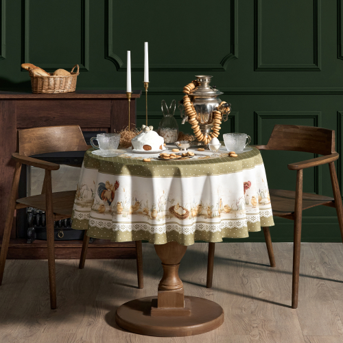 Принт с петухом, курочками и цыплятами в мягких зеленых оттенках придаёт скатерти атмосферу Пасхи и весеннего уюта. Деревенский мотив делает её выразительным элементом декора, благодаря которому стол становится центром внимания и гармоничным акцентом кухни, гостиной или дачи.