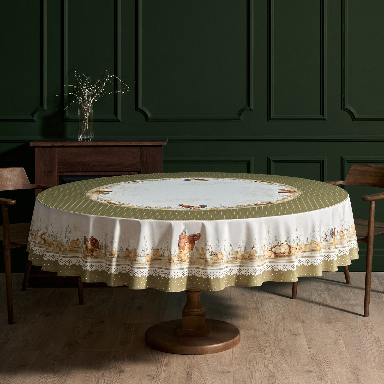 СКАТЕРТЬ КРУГЛАЯ "ЗОЛОТАЯ КУРОЧКА" 220СМ, 100% ХЛОПОК, ТВИЛ С ПРОПИТКОЙ