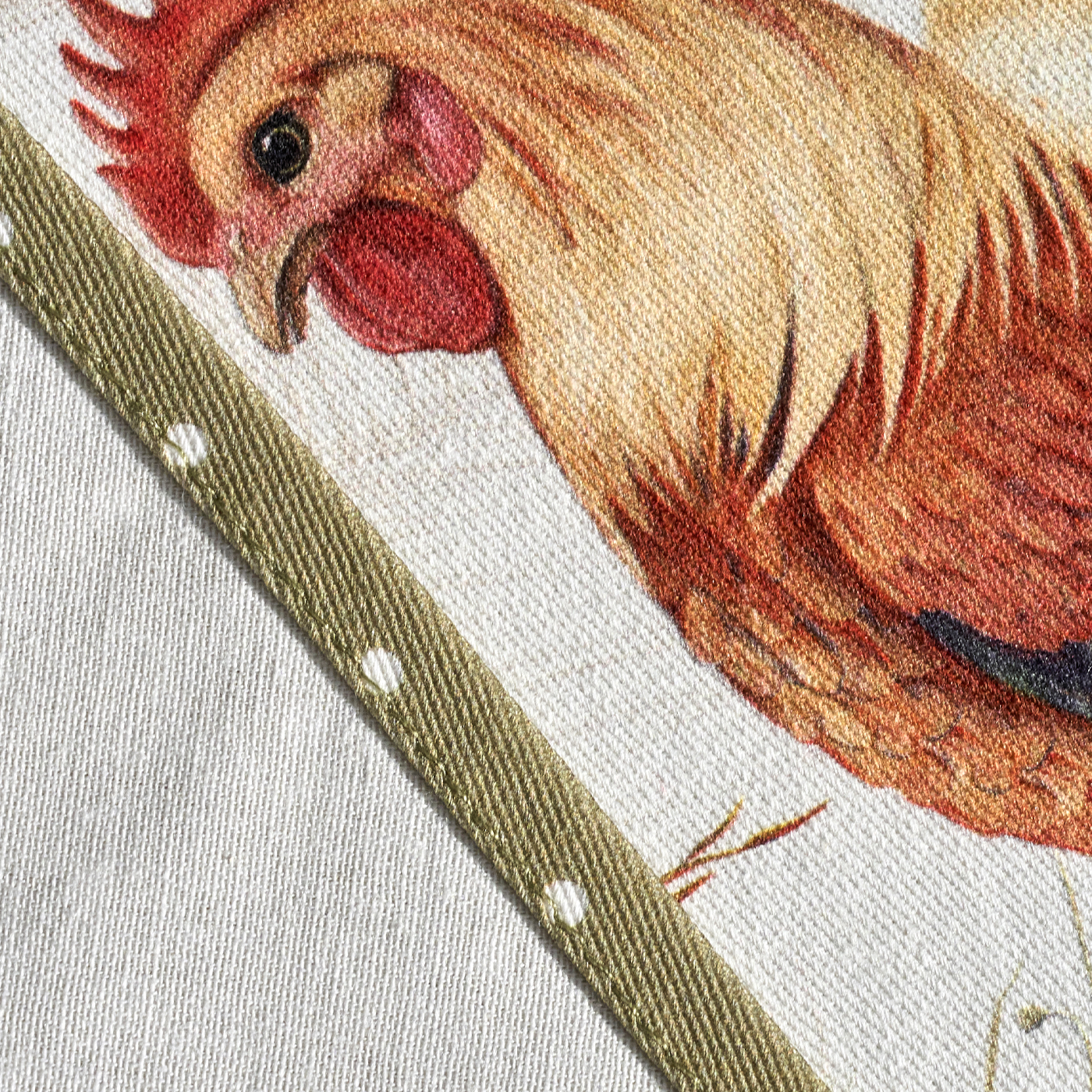 Принт с петухом, курочками и цыплятами в мягких зеленых оттенках придаёт скатерти атмосферу Пасхи и весеннего уюта. Деревенский мотив делает её выразительным элементом декора, благодаря которому стол становится центром внимания и гармоничным акцентом кухни, гостиной или дачи.