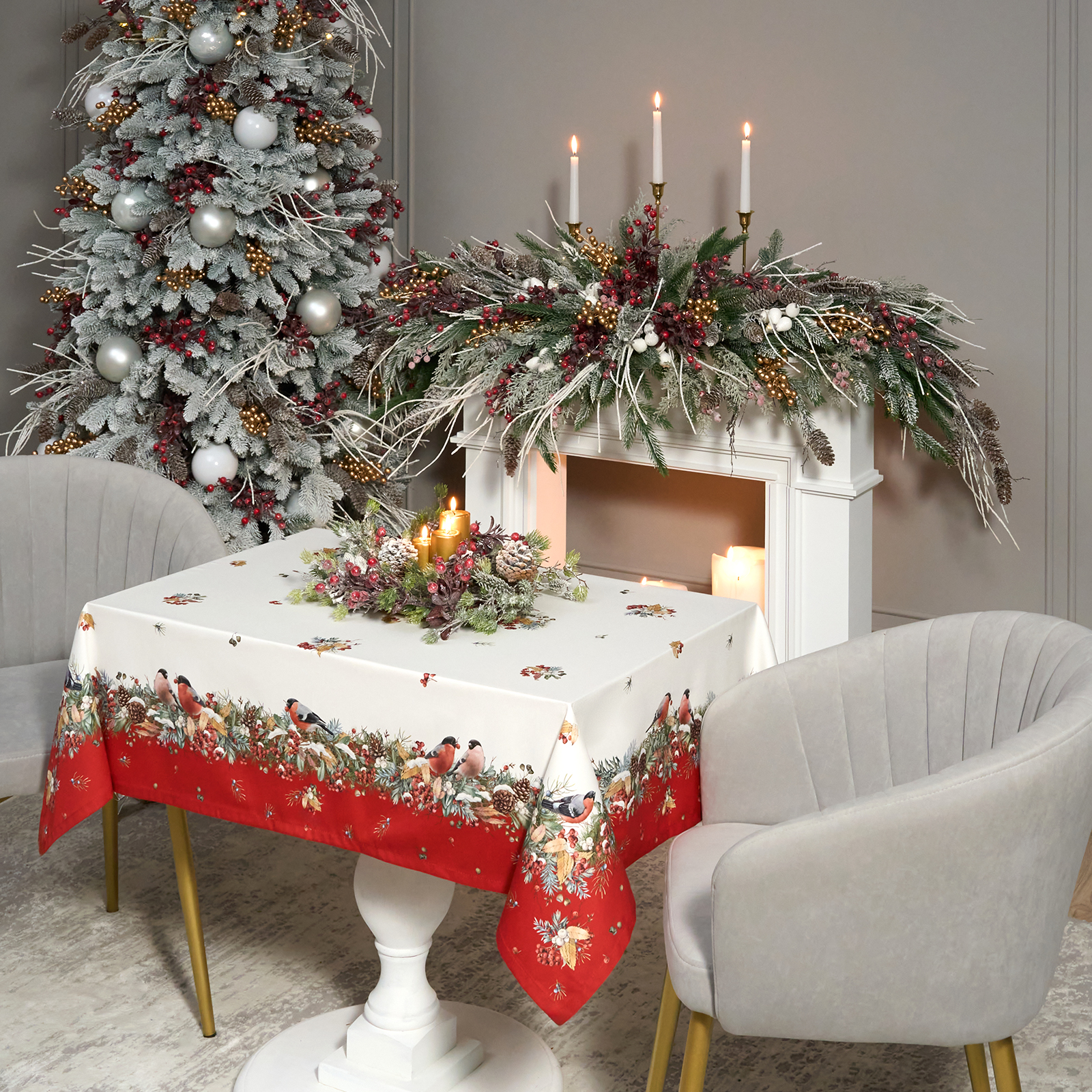 СКАТЕРТЬ "МОРОЗКО.СНЕГИРИ" 110Х140СМ ,КРАСНЫЙ, 100% ХЛОПОК,ТВИЛ ПРОПИТКА