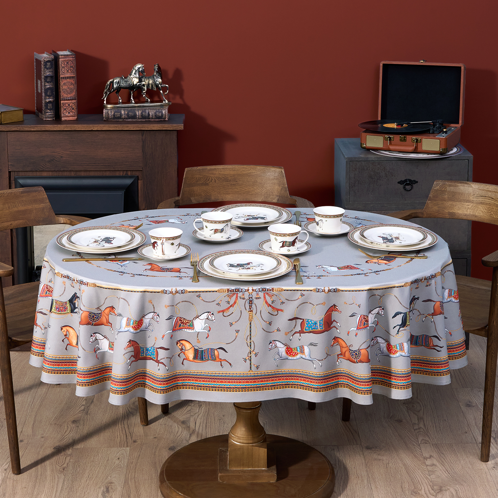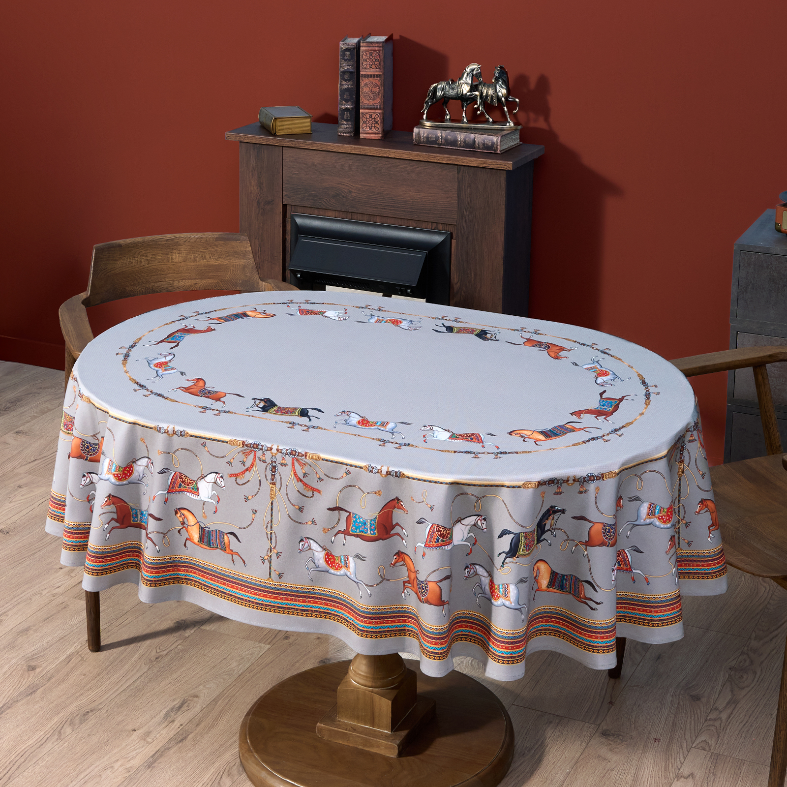 Благородный фон украшен орнаментом с грациозными лошадьми, создавая атмосферу восточной роскоши. Лошадь — символ 2026 года, поэтому скатерть будет актуальна как для ежедневного использования в интерьере в стиле бохо, так и для праздничной сервировки. Авторский принт разработан художниками эксклюзивно для Lefard и нанесён методом цифровой печати, что гарантирует яркость и стойкость красок даже после множества стирок.