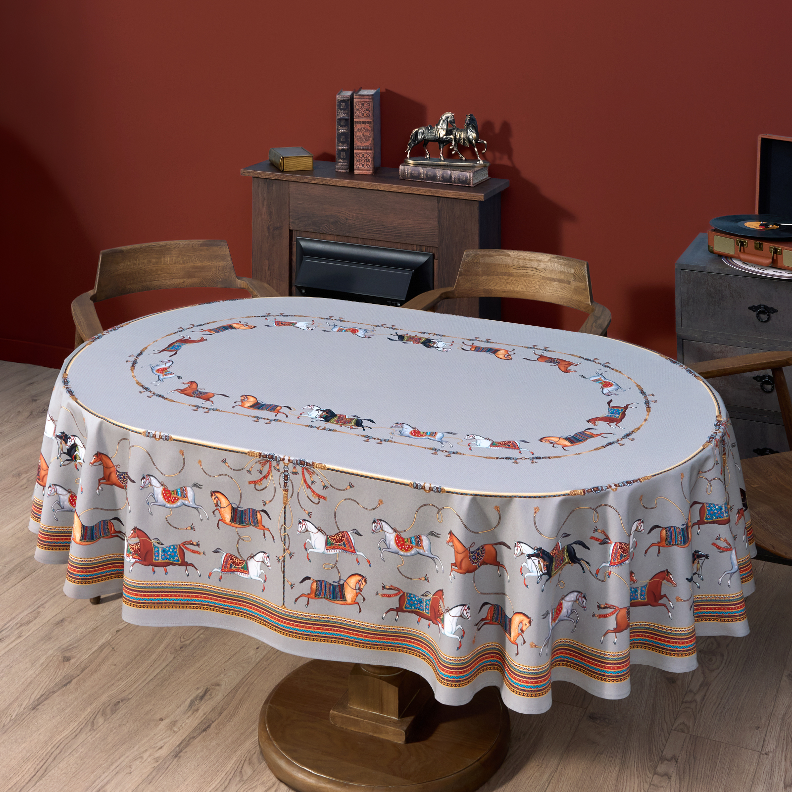 Благородный фон украшен орнаментом с грациозными лошадьми, создавая атмосферу восточной роскоши. Лошадь — символ 2026 года, поэтому скатерть будет актуальна как для ежедневного использования в интерьере в стиле бохо, так и для праздничной сервировки. Авторский принт разработан художниками эксклюзивно для Lefard и нанесён методом цифровой печати, что гарантирует яркость и стойкость красок даже после множества стирок.
