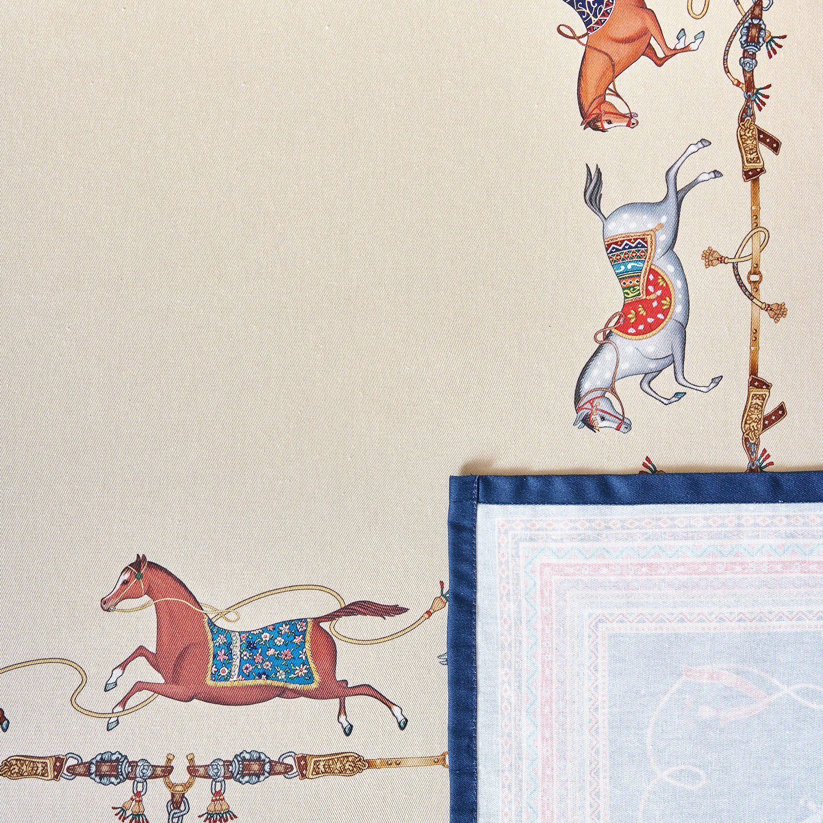 Темно-синий фон дополнен авторским орнаментом с изящными лошадьми — символом 2026 года. Такой акцент делает скатерть актуальной для праздничной сервировки и стильным украшением интерьера. Рисунок создан художниками Lefard и нанесён методом цифровой печати — краски сохраняют яркость даже после многократных стирок.