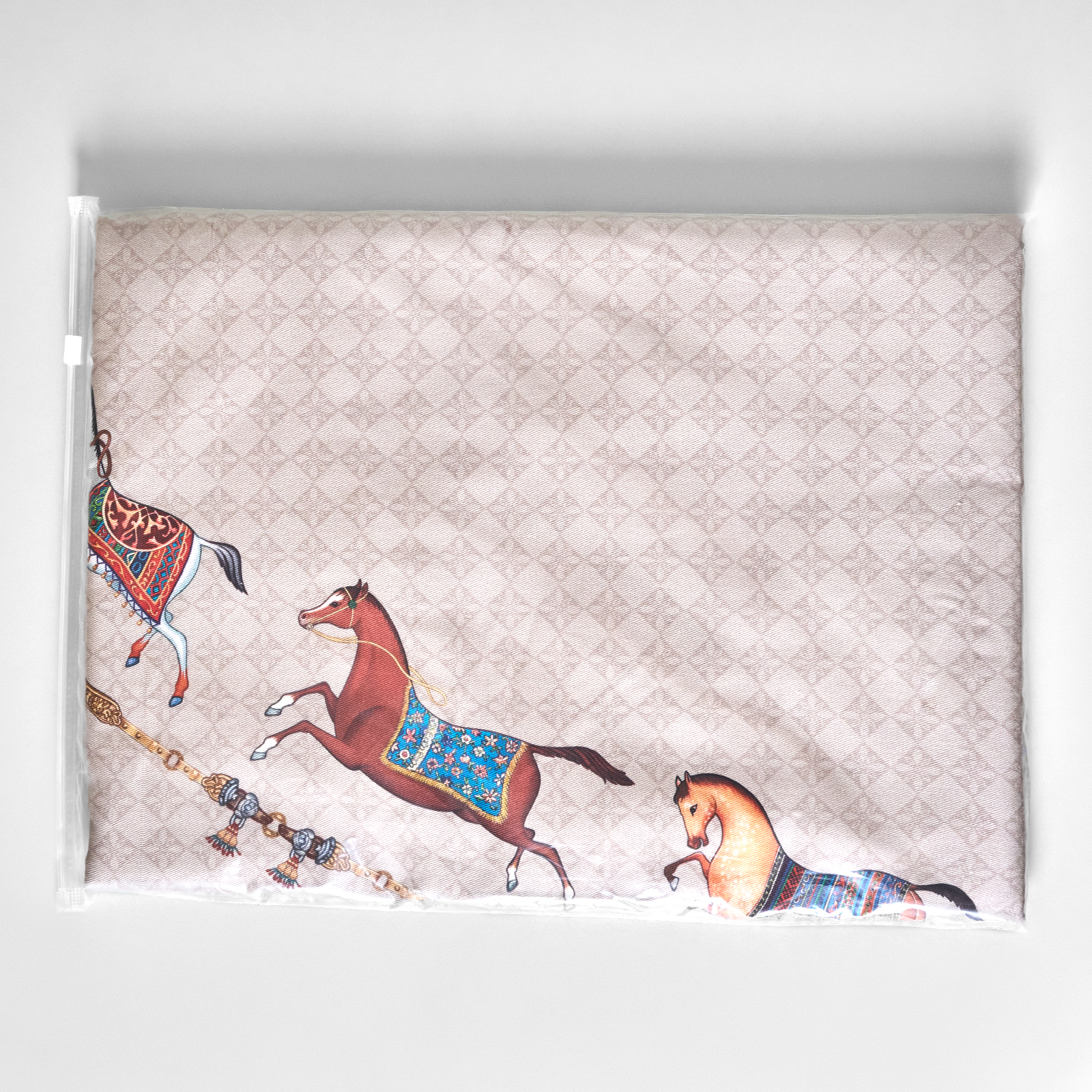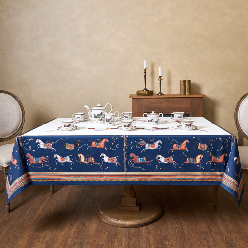 Элегантный бежевый фон украшен орнаментом с грациозными лошадьми, создавая атмосферу восточной роскоши. Лошадь — символ 2026 года, поэтому скатерть будет актуальна как для ежедневного использования в интерьере в стиле бохо, так и для праздничной сервировки. Авторский принт разработан художниками эксклюзивно для Lefard и нанесён методом цифровой печати, что гарантирует яркость и стойкость красок даже после множества стирок.