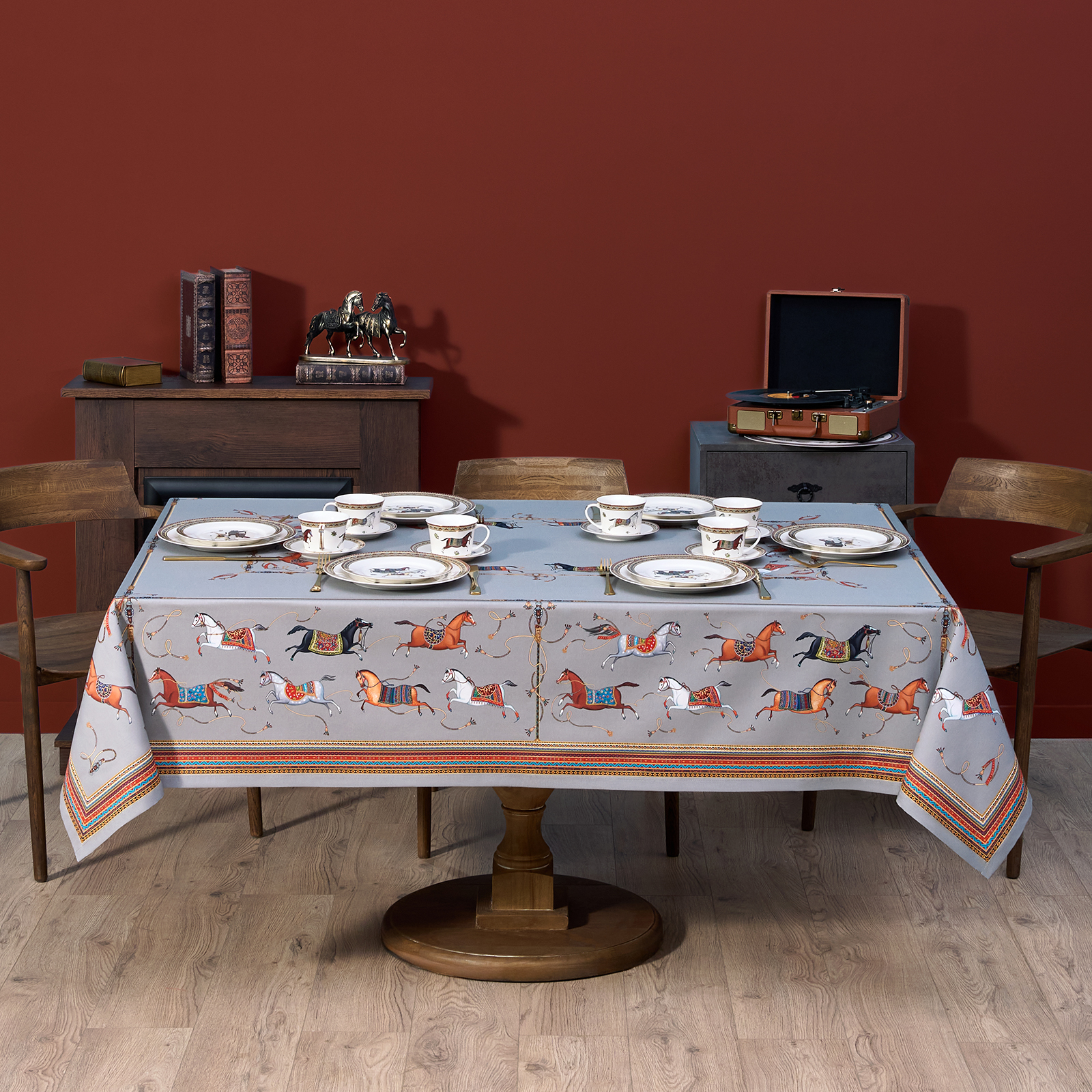 Благородный фон украшен орнаментом с грациозными лошадьми, создавая атмосферу восточной роскоши. Лошадь — символ 2026 года, поэтому скатерть будет актуальна как для ежедневного использования в интерьере в стиле бохо, так и для праздничной сервировки. Авторский принт разработан художниками эксклюзивно для Lefard и нанесён методом цифровой печати, что гарантирует яркость и стойкость красок даже после множества стирок.