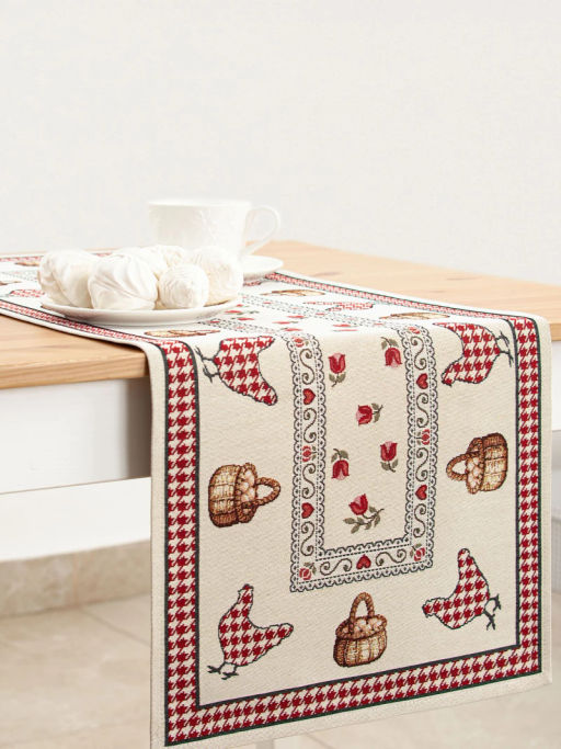Петушки и курочки красный бордюр Салфетка 44х140 см 2101265
