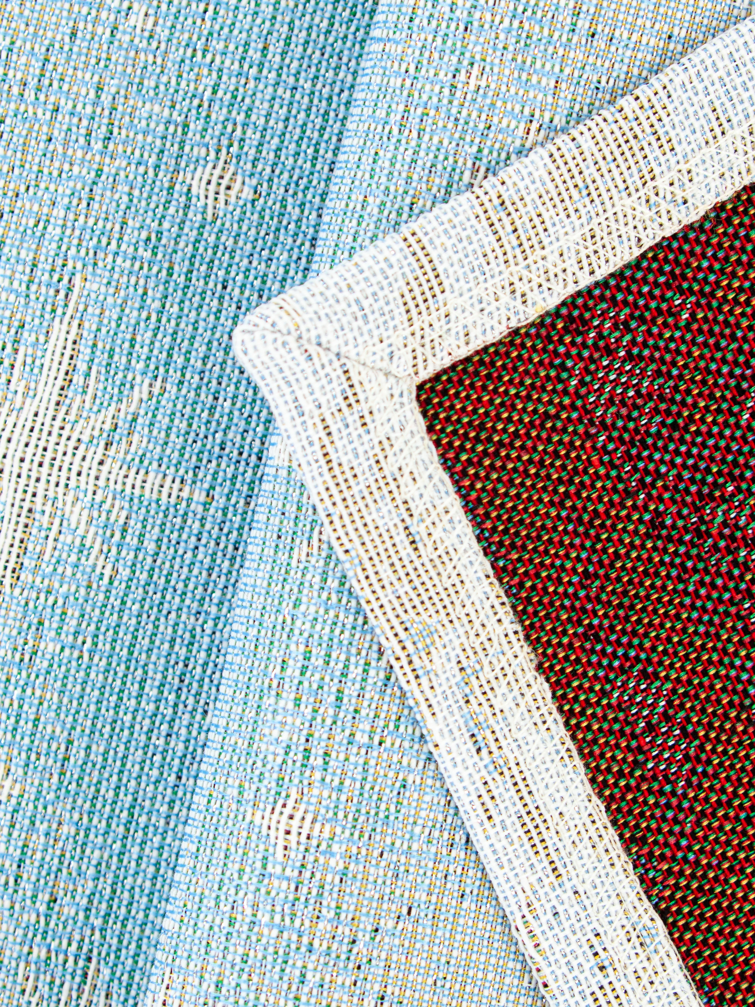 Рисунок создается переплетением нитей различных цветов и фактуры. Состав ткани: хлопок ( дающий фактуру и приятную тактильность ) и синтетические нити ( придающие износостойкость ). Плотность гобелена 410 г на кв.метр.