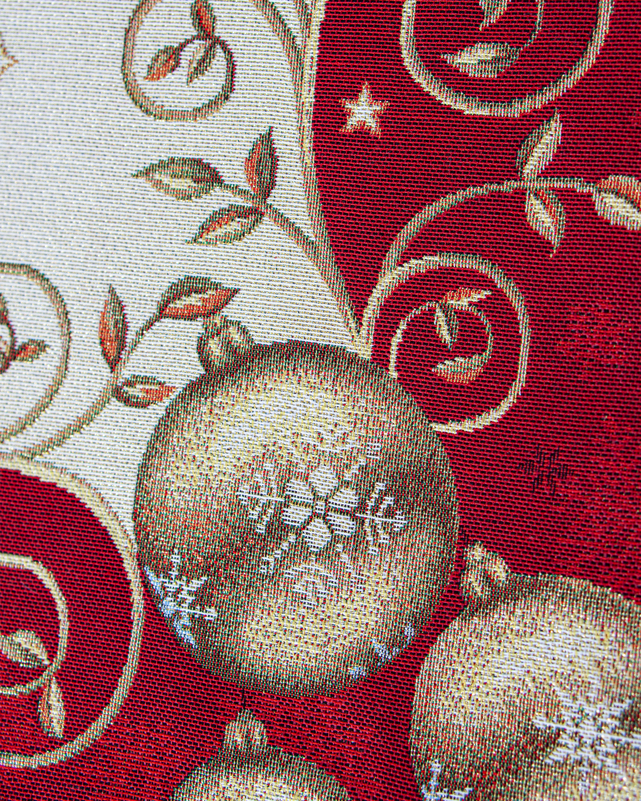 Рисунок создается переплетением нитей различных цветов и фактуры. Состав ткани: хлопок ( дающий фактуру и приятную тактильность ) и синтетические нити ( придающие износостойкость ). Плотность гобелена 410 г на кв.метр.