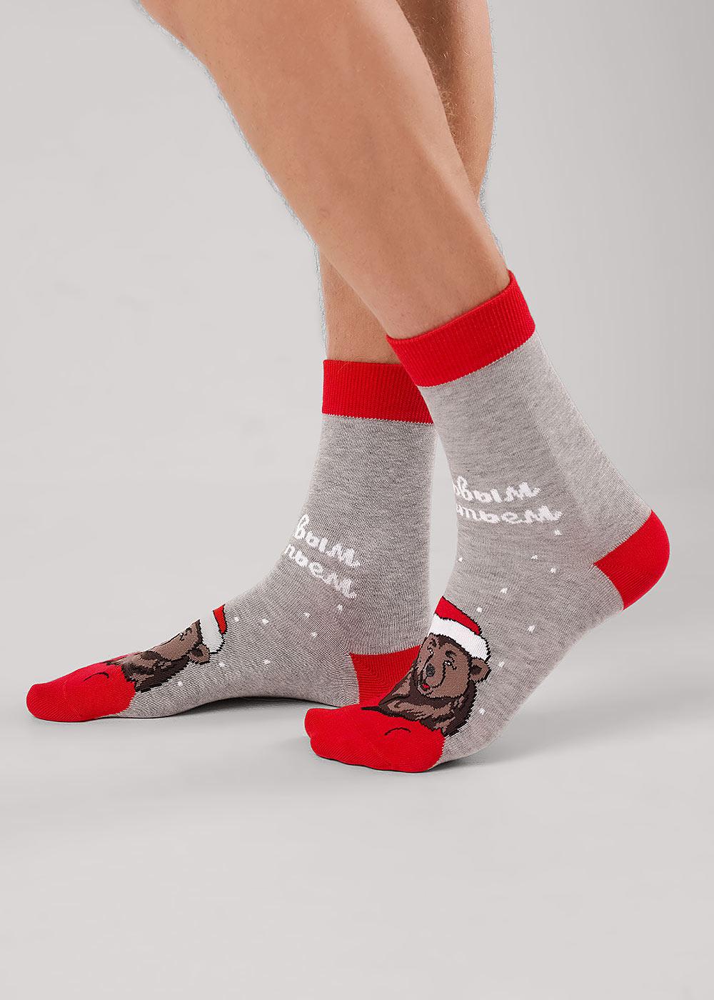 носки мужские с выделенным мыском, пяткой, бортом, с рисунком медведя и надписью с новым счастьем