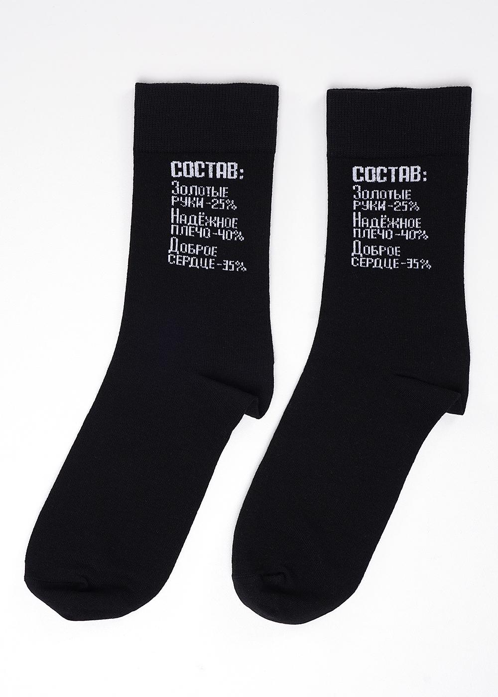 Мужские носки с надписью "Состав: золотые руки - 25%, надежное плечо - 40%, доброе сердце - 35%".