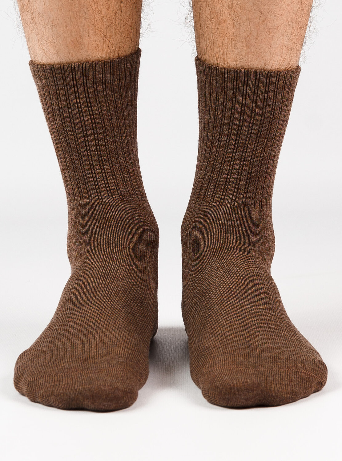 Мужские носки (Арт.4007SLWE) от торговой марки Индефини. Мужские высокие теплые носки коричневого цвета изготовлены из смеси материалов для комфорта и тепла. Они содержат вискозу и полиэстер для мягкости и воздухопроницаемости, акрил для прочности и эластан для эластичности. Кроме того, они содержат овечью шерсть для дополнительного тепла. Эти носки идеально подходят для холодных дней и гарантируют удобство в течение всего дня.
