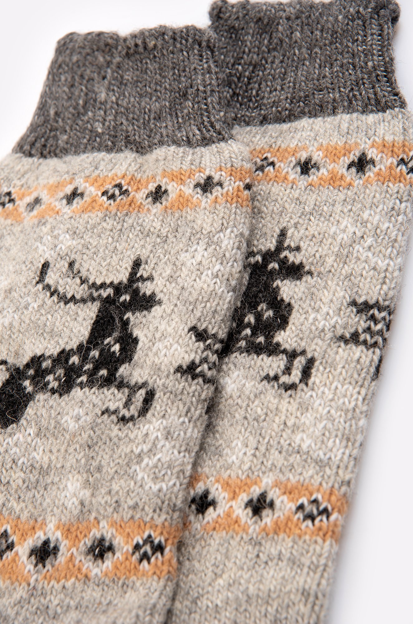 Мужские носки выполнены из приятной к телу шерстяной пряжи. Высокие носки идеальны для осенних вечеров. Носки представлены в сером цвете и украшены рисунком олень.