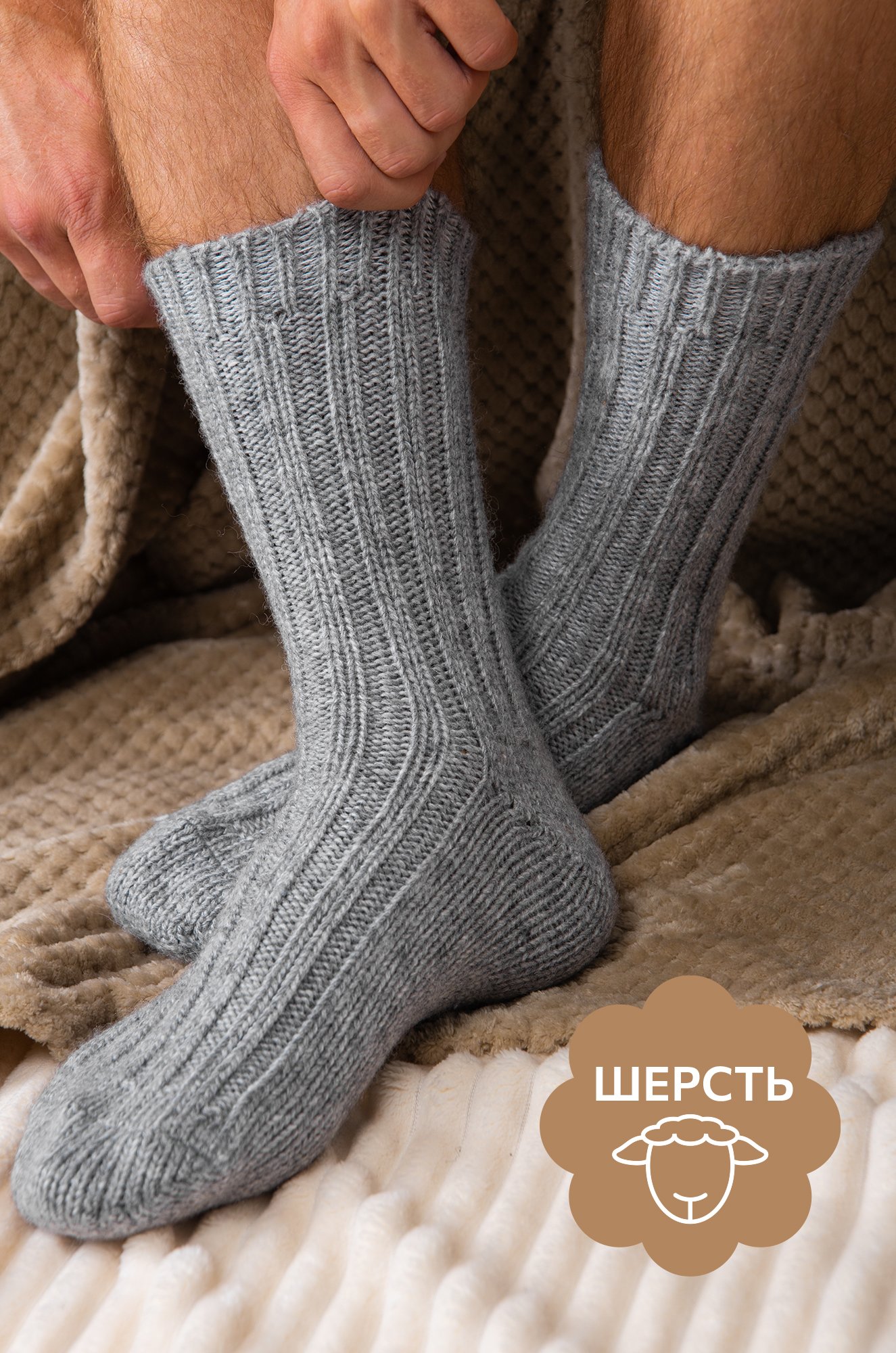 Мужские сер..показатьые носки выполнены из приятной к телу шерстяной пряжи. Однотонные высокие носки идеальны для уютных осенних вечеров и зимних прогулок. Теплые носки украшены вывязанным вертикальным рубчиком.