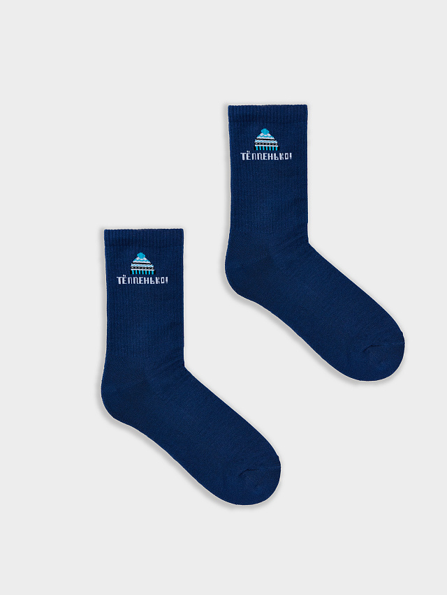 Носки мужские в джинсово-синем цвете с рисунком в виде надписи "Тепленько"