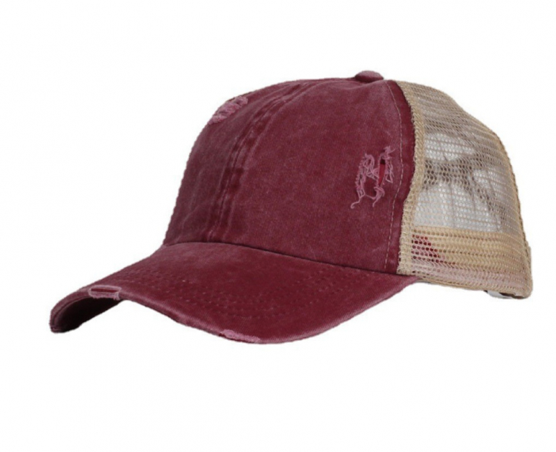 Бейсболка джинсовая потертая с сеткой. Бордовая