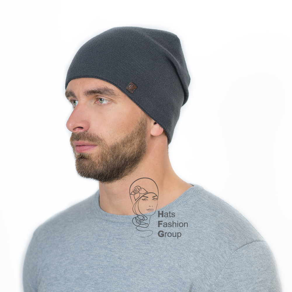 Мужская гладкая шапка из полушерстяной пряжи с закрепкой сзади. Закрепка придает дополнительный объем изделию.  Сбоку шапка украшена фирменной шильдой из кожи.