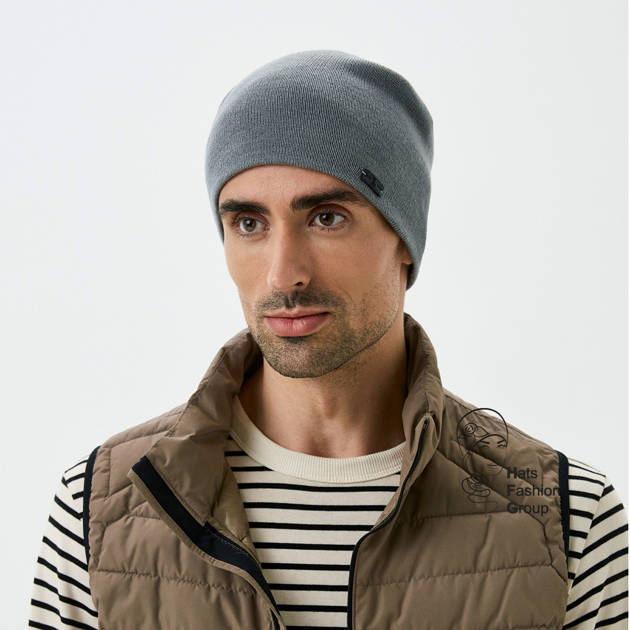 Двойная мужская шапка-бини. Длина изделия - 23 см. Шапка выполнена из полушерстяной пряжи. Сбоку шапка украшена фирменной кожаной шильдой.
