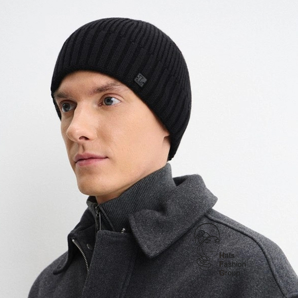Мужская полуторная шапка по голове. Шапка выполнена из полушерстяной пряжи. Вязка резинкой придает дополнительный объем изделию. Сбоку шапка украшена фирменной кожаной шильдой. Длина изделия - 20 см.