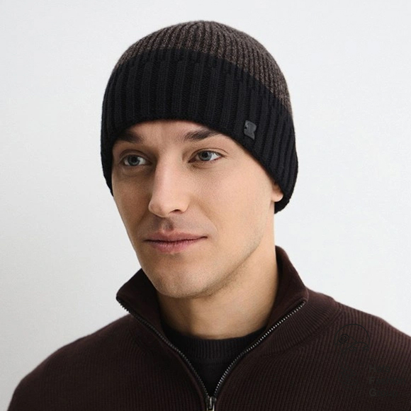 Полуторная шапка по голове. Двухцветная шапка выполнена из полушерстяной пряжи. Сбоку шапка украшена фирменной кожаной шильдой. Длина изделия - 20 см.