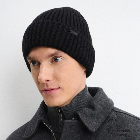 Теплая мужская шапка по голове. Шапка с отворотом, выполнена из полушерстяной пряжи, утеплена флисом. Вязка резинкой 2х2 придает дополнительный объем изделию. Сбоку шапка украшена фирменной кожаной шильдой. Длина изделия - 22 см, отворот - 8 см.
