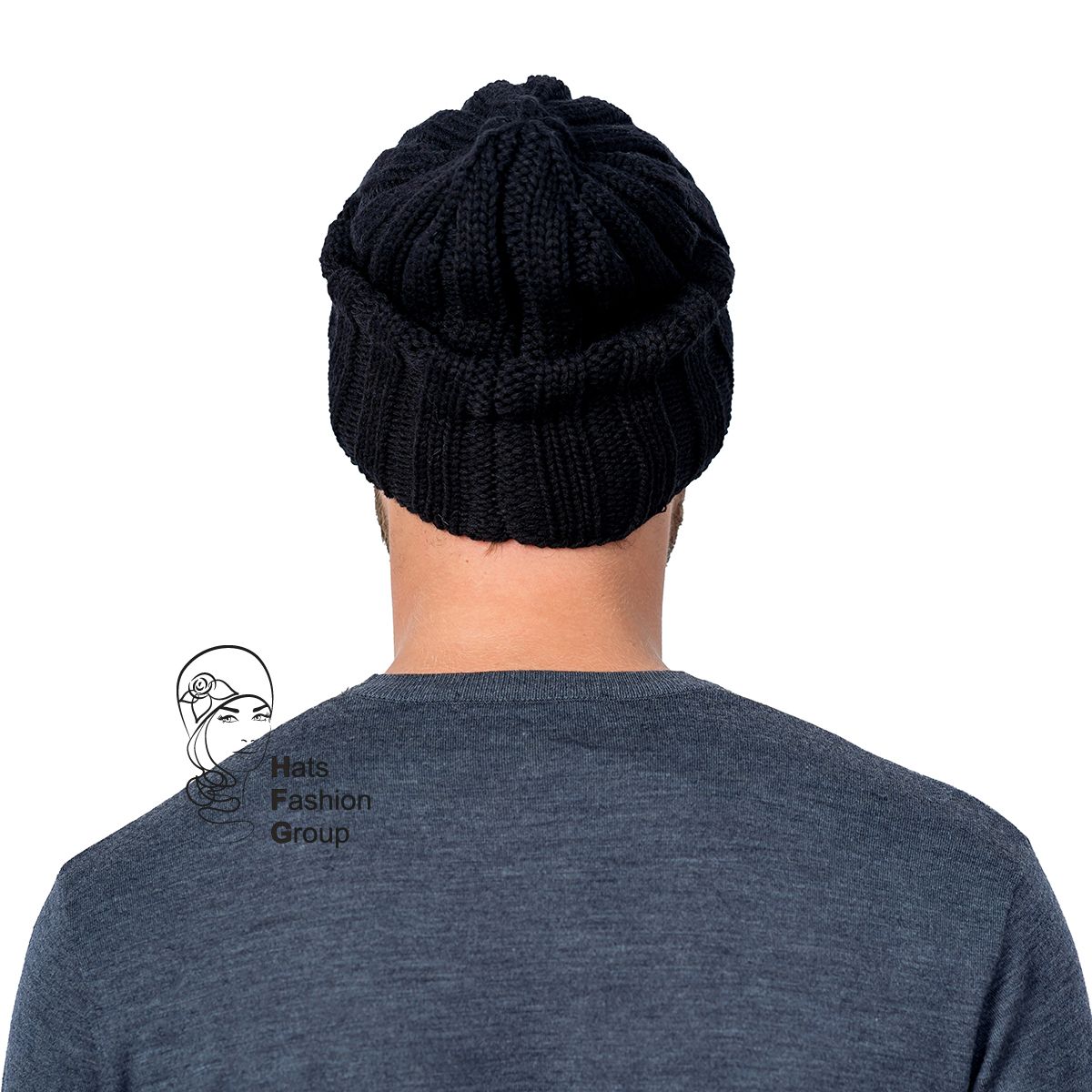 Удлиненная теплая мужская шапка-колпак. Шапка одинарная, выполнена из полушерстянной пряжи, вязка "английская  резинка 2х2". Сбоку шапка украшена фирменной кожаной шильдой. Шапка комфортная, легко укладывается.