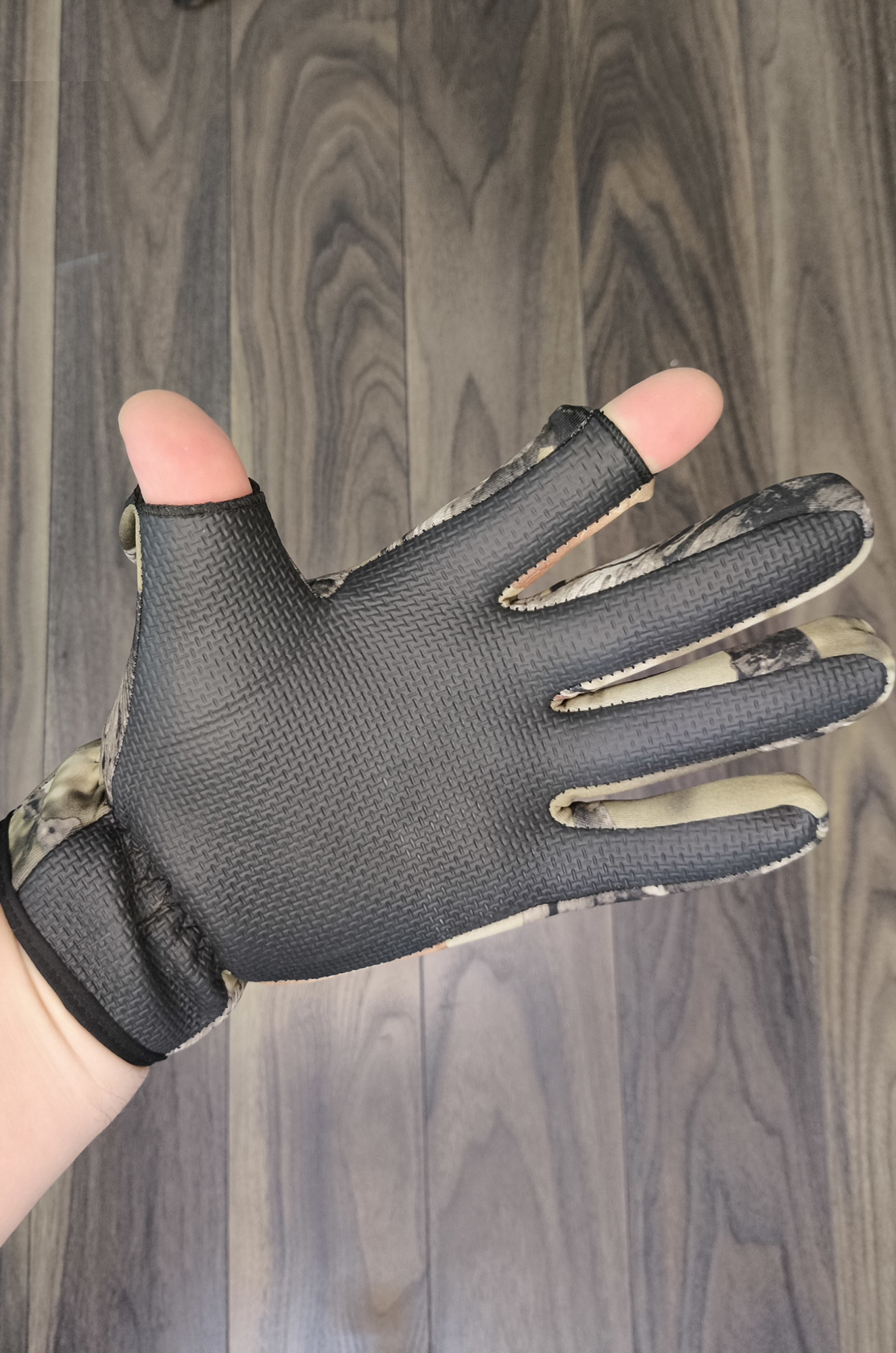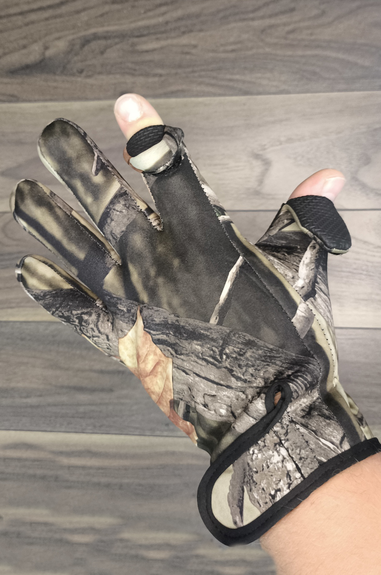 Мужские перчатки из непромокаемой ткани без утеплителя с двумя открывающимися пальцами на липучке. На ладони нескользящий дизайн, на запястье липучка. Производство Китай.