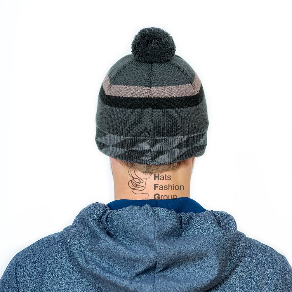 Мужская одинарная шапка оформлена геометрическим рисунком из пряжи нескольких цветов. Помпон на макушке выполнен из ниток основной пряжи. Шапка сбоку украшена фирменной шильдой из кожи.