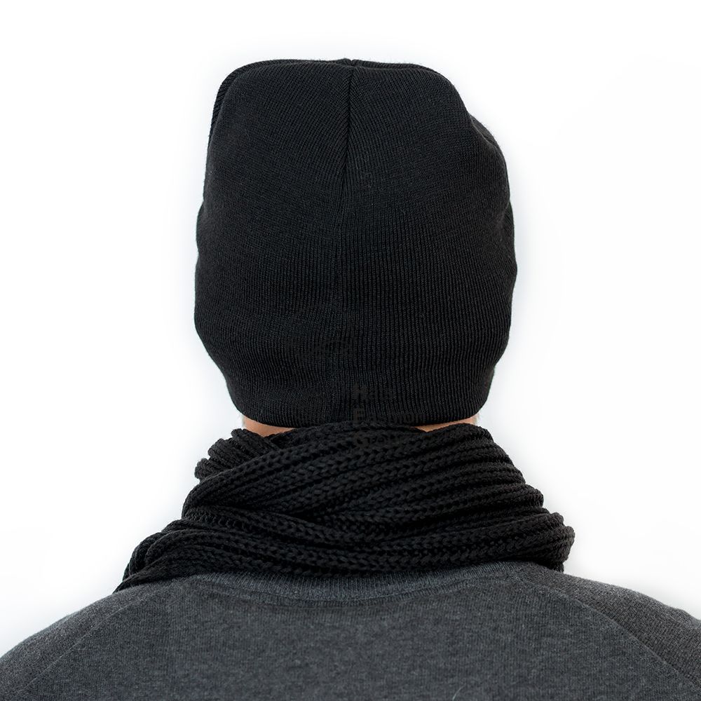 Тонкая мужская двойная мужская шапка-бини из полушерстяной пряжи. Сбоку украшена фирменной шильдой из кожи.