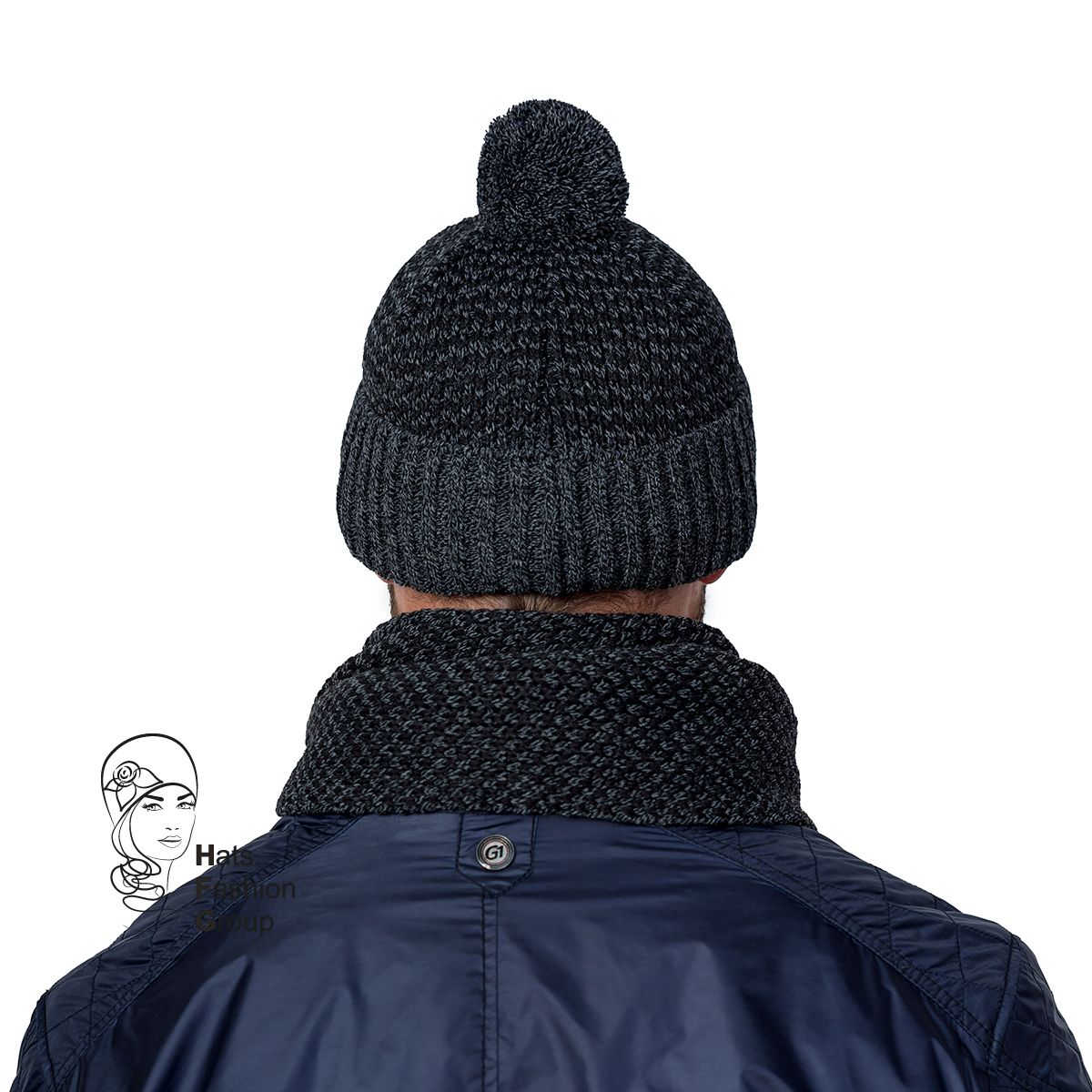 Мужской комплект 2-ка из полушерстяной пряжи. Теплая шапка по голове с отворотом и помпоном. Помпон выполнен из ниток основной пряжи. Сбоку шапка украшена фирменной кожаной шильдой. Шарф размером 20х170 см.