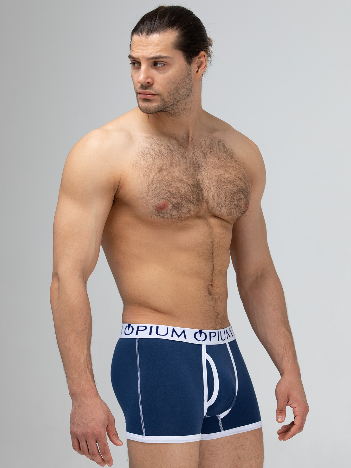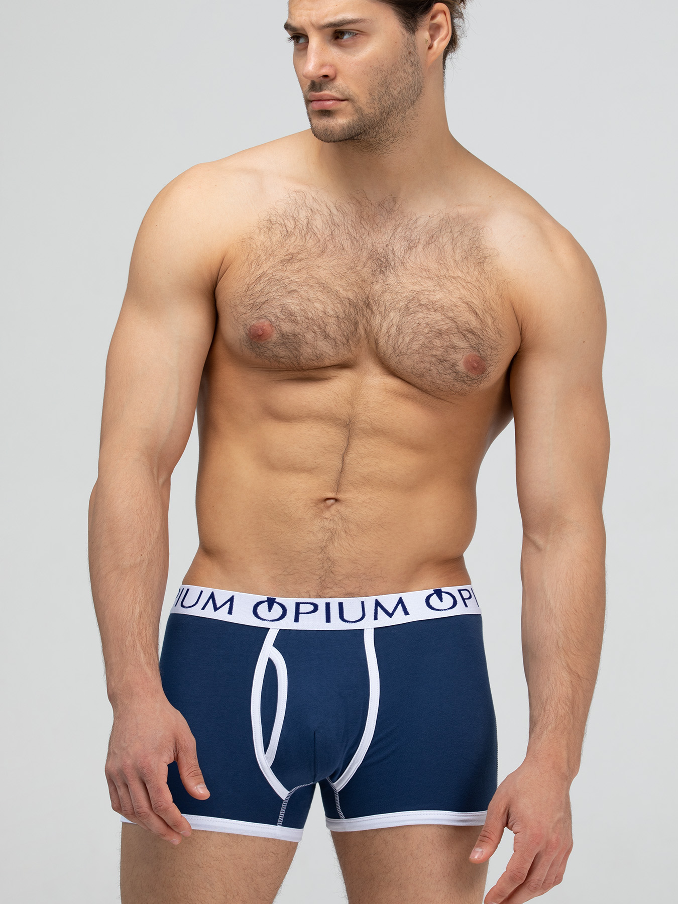 Хит продаж, любимая всеми мужчинами модель боксеров из хлопка с эластаном, модное сочетание синего с белым, комфортная резинка с фирменным логотипом OPIUM.
