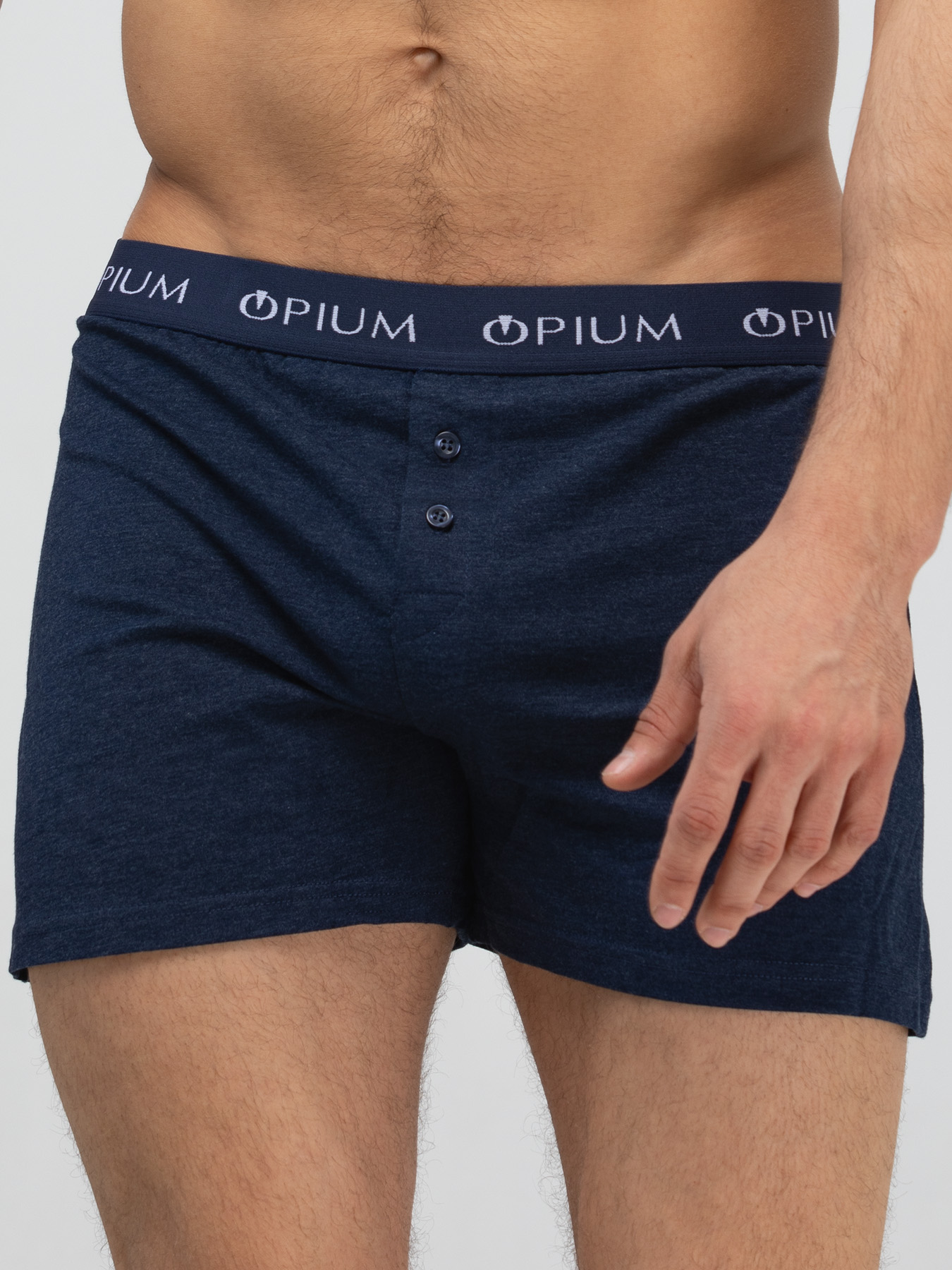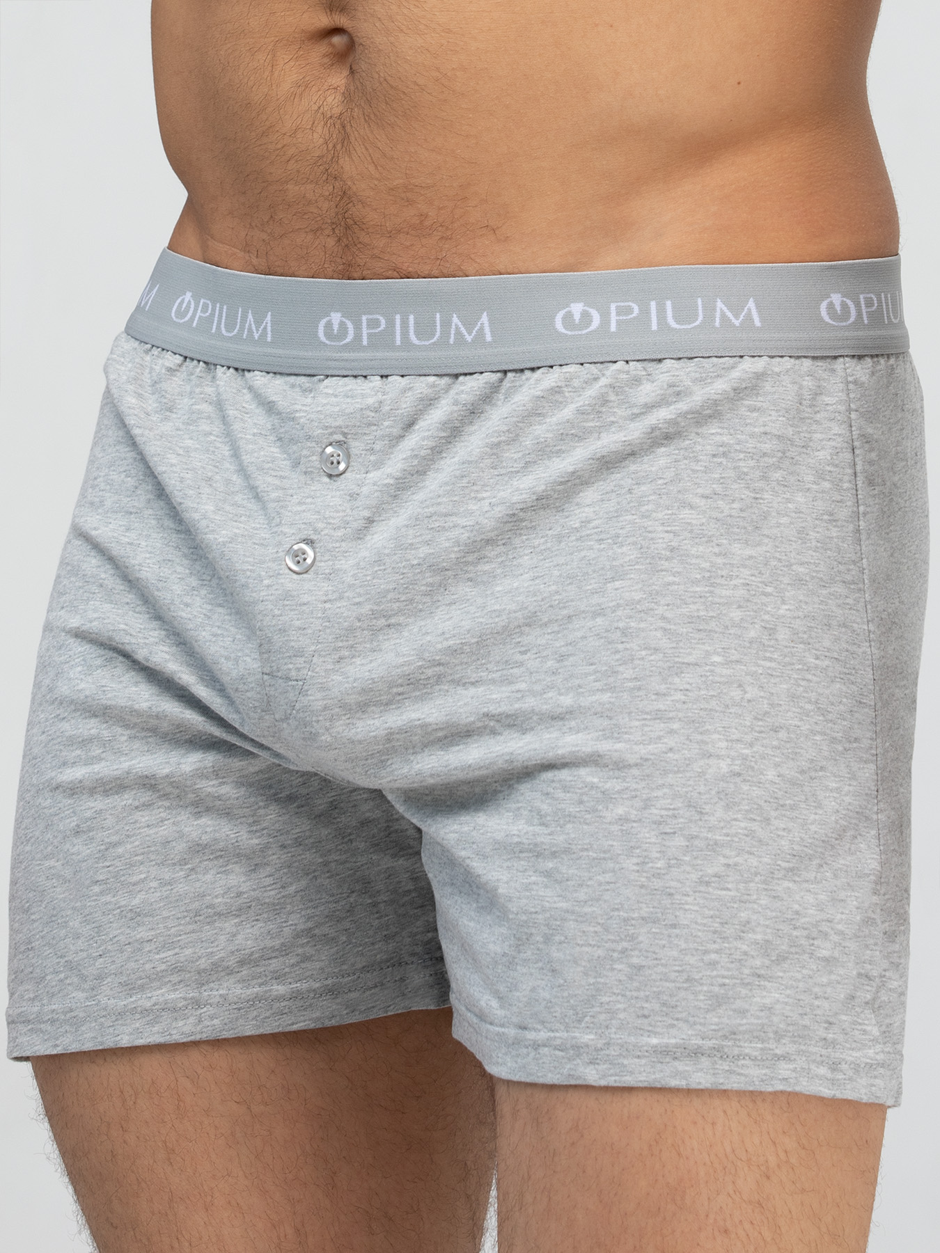 Классические боксеры свободного покроя, из хлопка с эластаном, с фирменной резинкой с логотипом OPIUM. Выполнены в классических цветах – черном, сером меланж и синем меланж..
