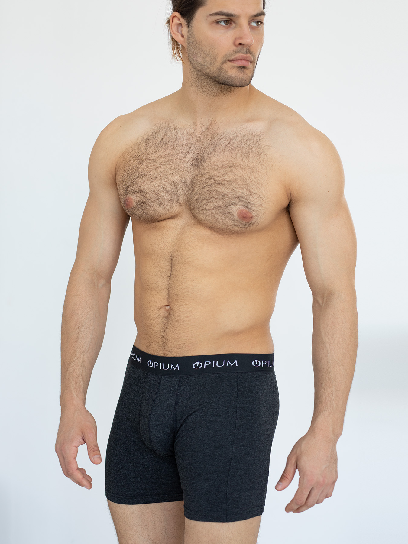 Популярная классическая модель удлиненных боксеров из меланжевой ткани. Комфортная резинка с логотипом Opium. Выполнены в цвете «мокрый асфальт».