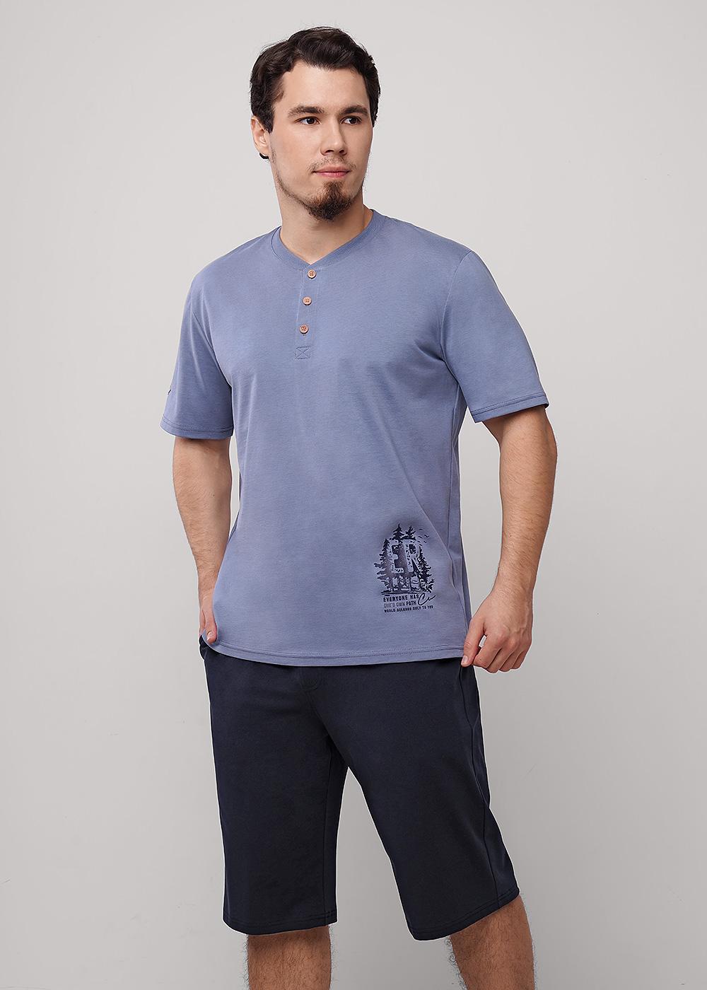 Набор мужской состоящий из футболки и шорт. Футболка из кулирной глади с декоративной планкой на пуговицы и дизайнерским принтом. Шорты из плотной кулирной глади на эластичном поясе и регулируемым шнуром, по бокам удобные карманы.