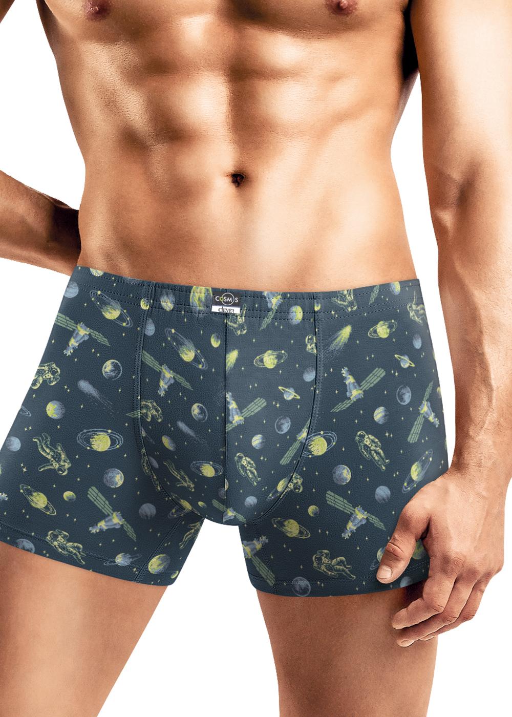 Шорты удлиненные комфортной посадки выполнены из оригинального полотна в фешн набивку "космонавты". Трусы дополнены фирменным жаккардовым логотипом.