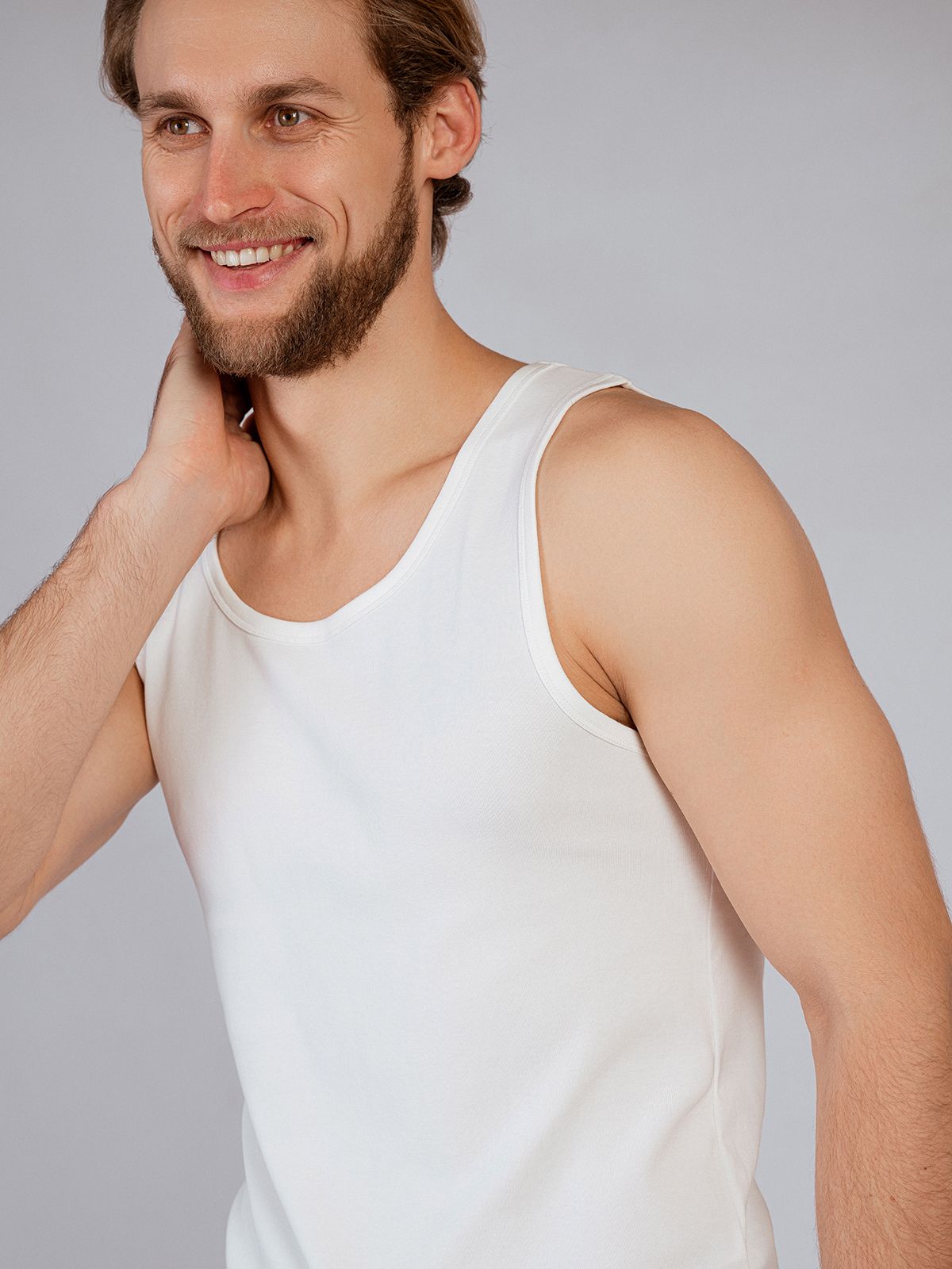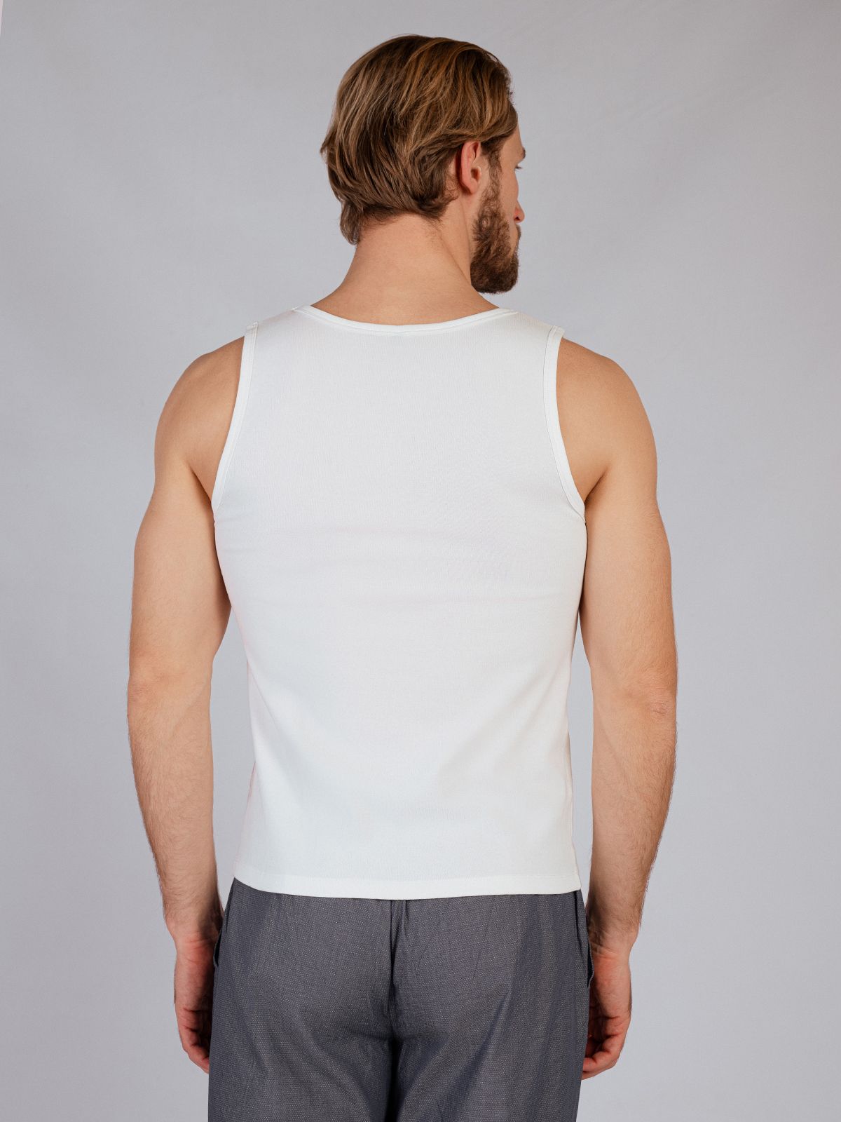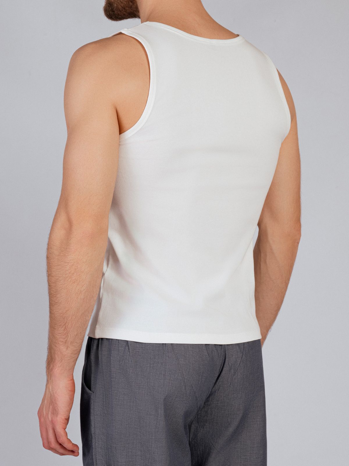 Майка мужская, выполненная в белом цвете, изготовлена из натурального хлопка. Прямой крой и широкие бретели обеспечивают удобную посадку и свободу движений, а рубчатая фактура ткани подчеркивает эластичность и придает мужской майке Indefini выразительный вид.