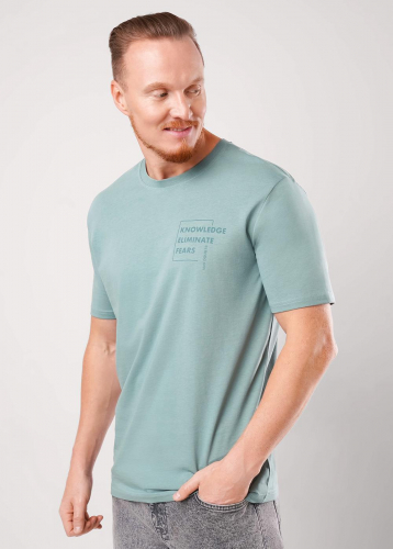 Фуфайка с коротким рукавом среднего объема, круглый вырез, горловина оформлена обтачкой из рибаны. Дополнена оригинальным принтом.