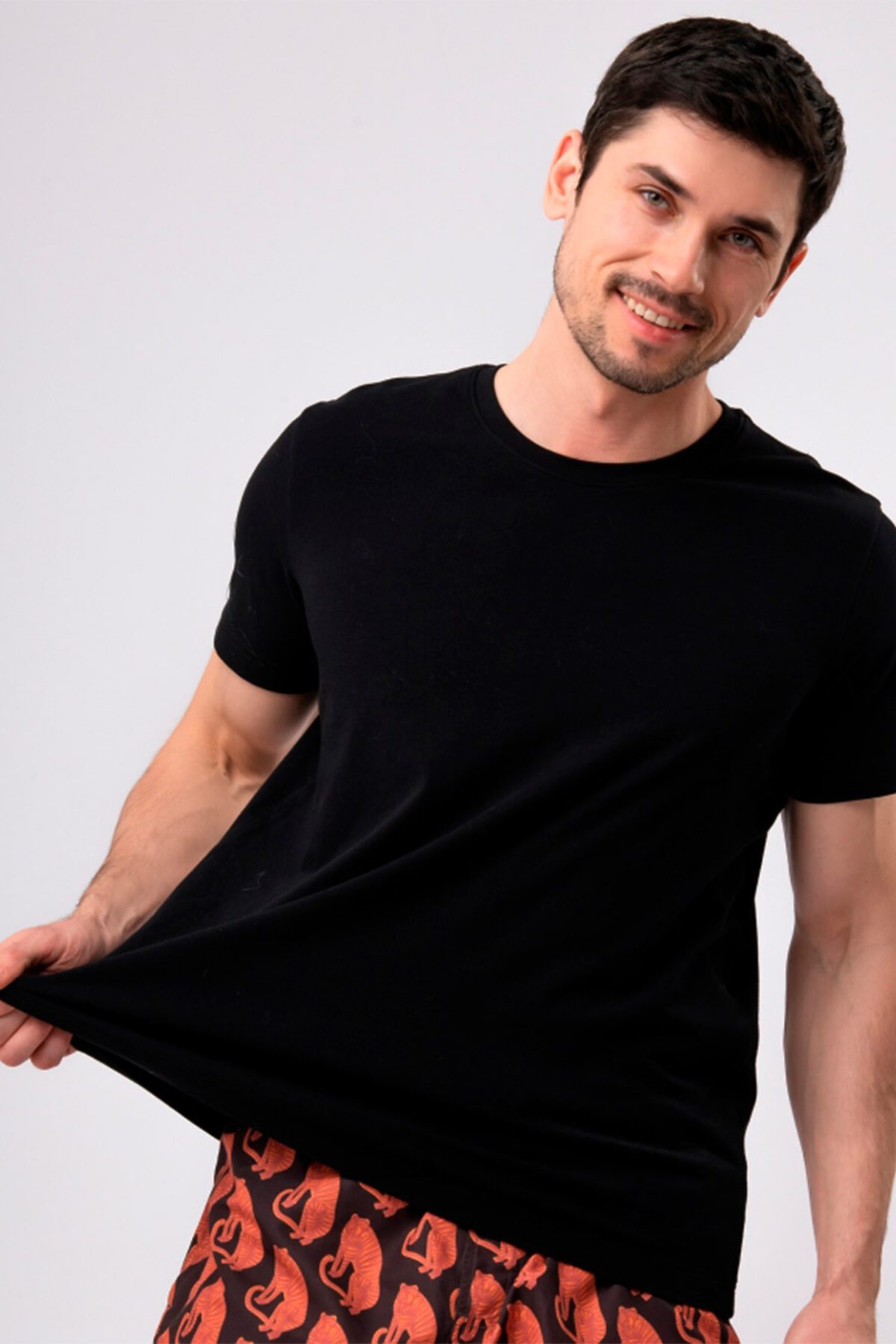 Домашняя футболка от торговой марки Индефини. Трикотажная черная футболка свободного кроя из дышащей, легкой 100% хлопковой ткани с гладкой фактурой. С классическим круглым вырезом горловины без воротника, с короткими рукавами с закрепленными отворотами, со спущенной линией плеча.