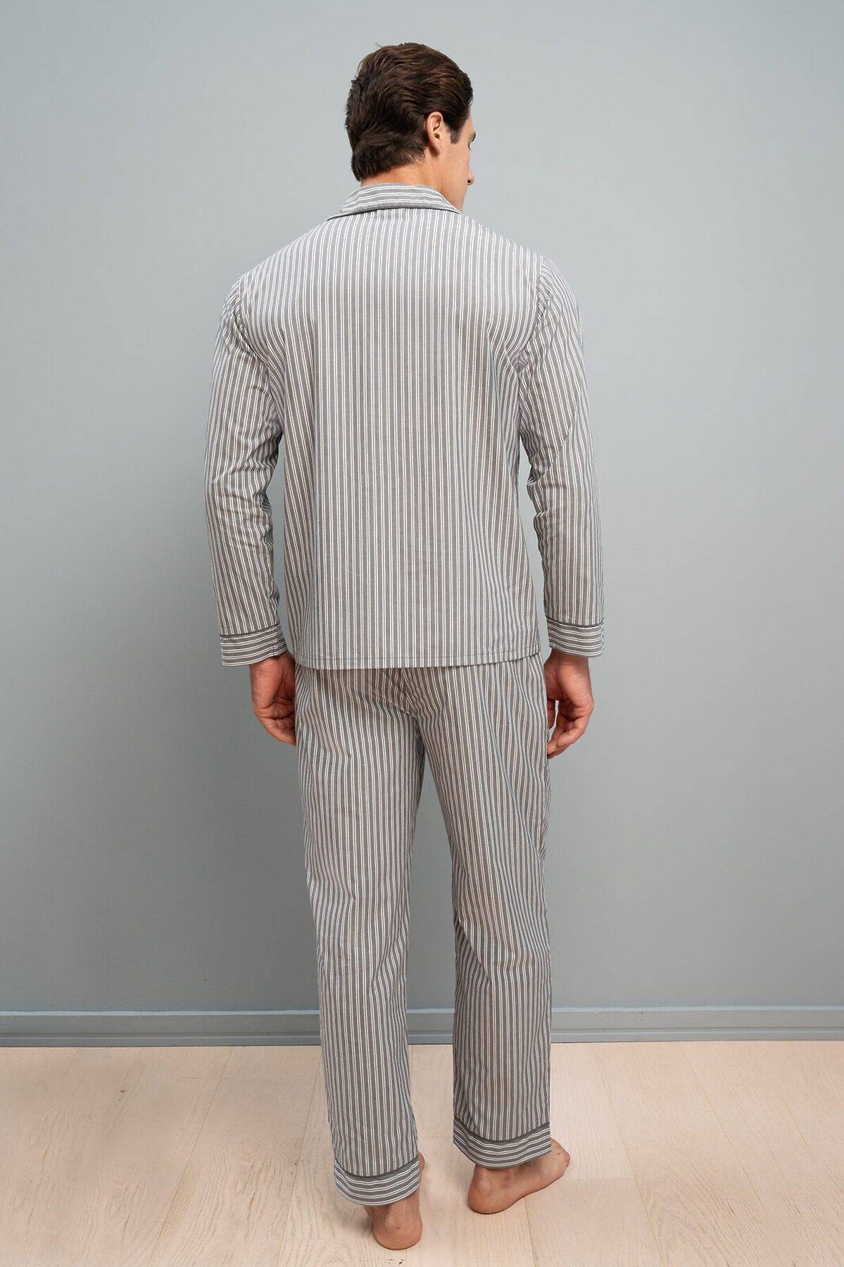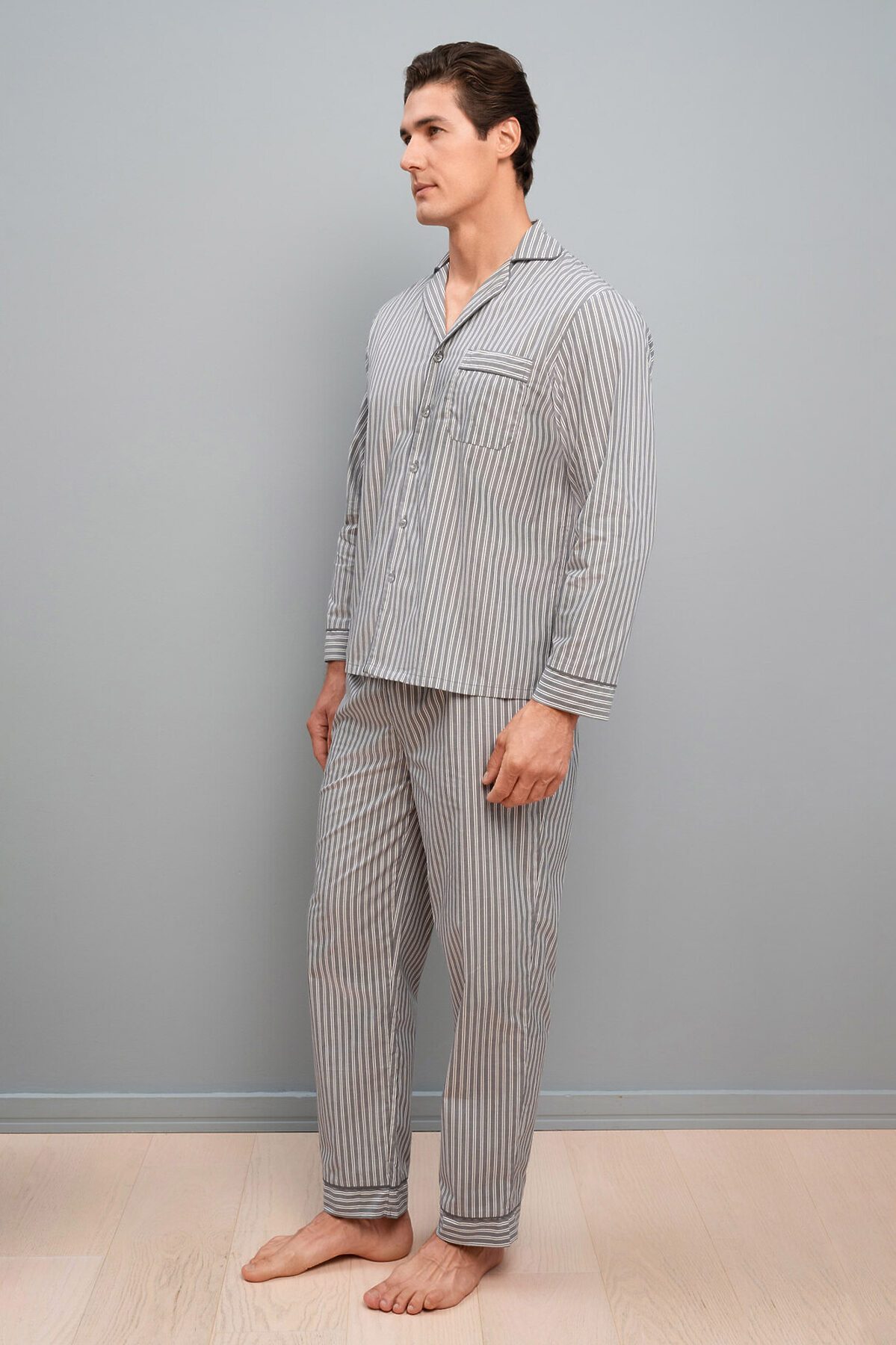 Мужская пижама в бело-серую полоску из натурального хлопка состоит из рубашки и брюк. Мягкий хлопковый материал приятен к телу, создавая ощущение легкости, что делает пижаму отличным выбором для уютных вечеров и спокойного сна. Рубашка на пуговицах с длинными рукавами и манжетами обеспечивает уют и элегантный вид, а нагрудный карман позволяет хранить мелкие вещи. Брюки, выполненные на мягкой эластичной резинке с регулирующим шнурком, обеспечивают оптимальную посадку и свободу движений.