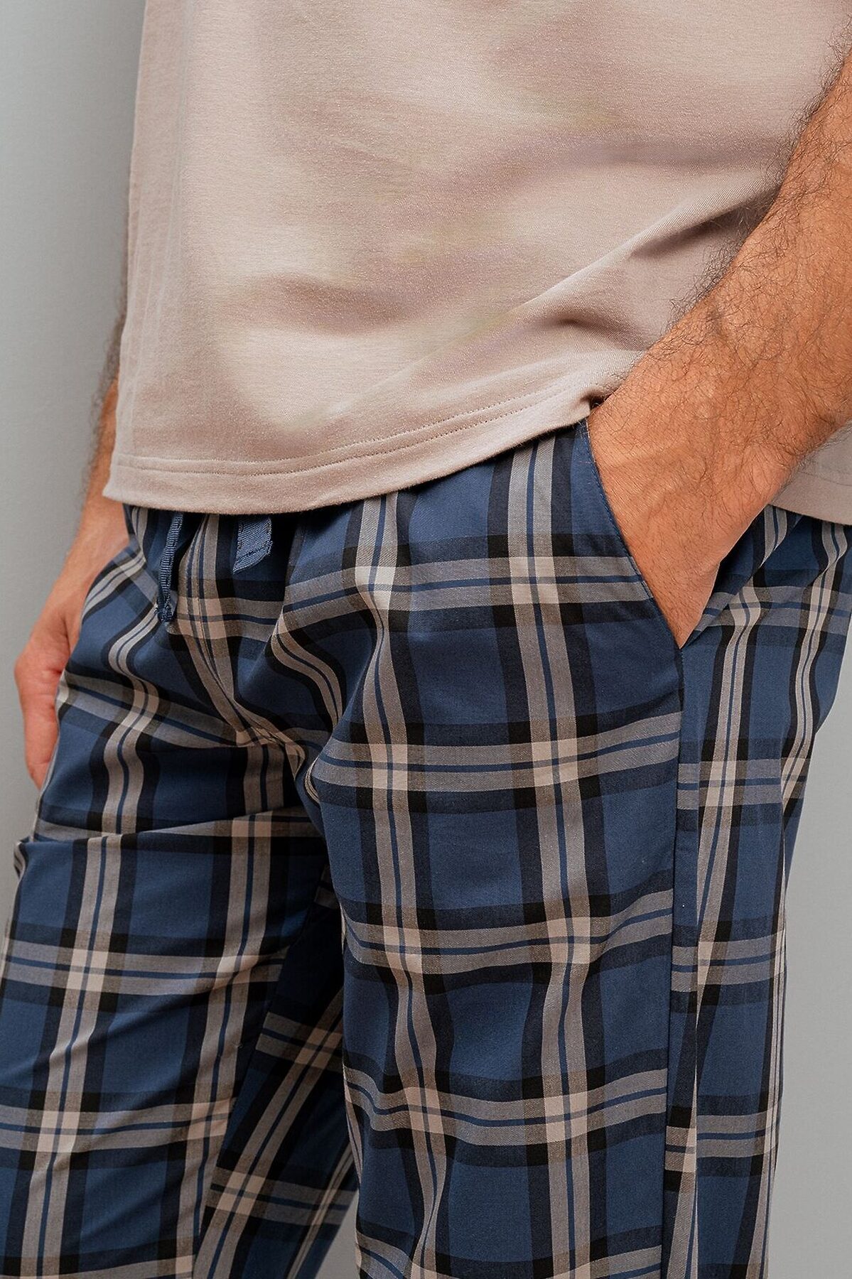 Мужская пижама 4047PBC бренда Indefini, изготовленная из хлопка, состоит из футболки и брюк. Футболка свободного кроя с короткими рукавами и круглым вырезом. Брюки прямого кроя с мягкой эластичной резинкой и регулирующим поясом обеспечивают оптимальную посадку. Брюки украшены клетчатым принтом.