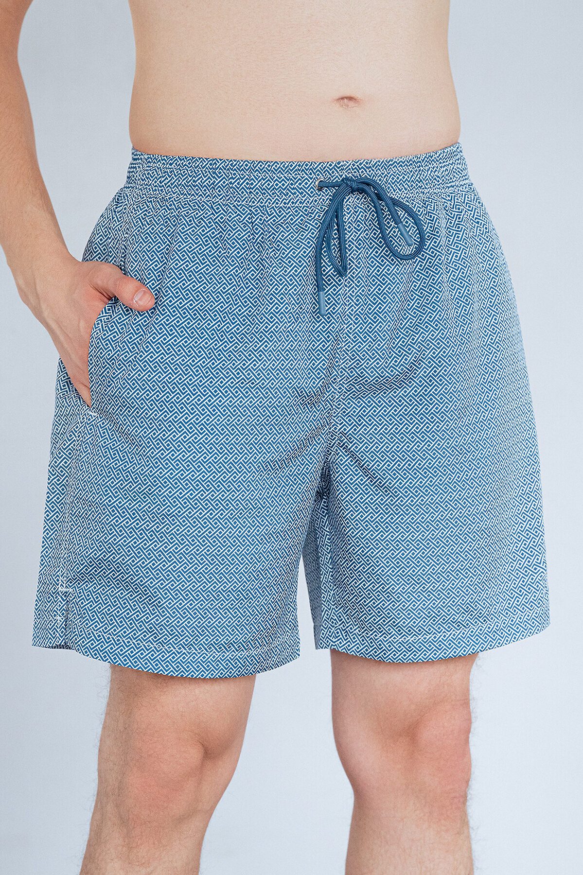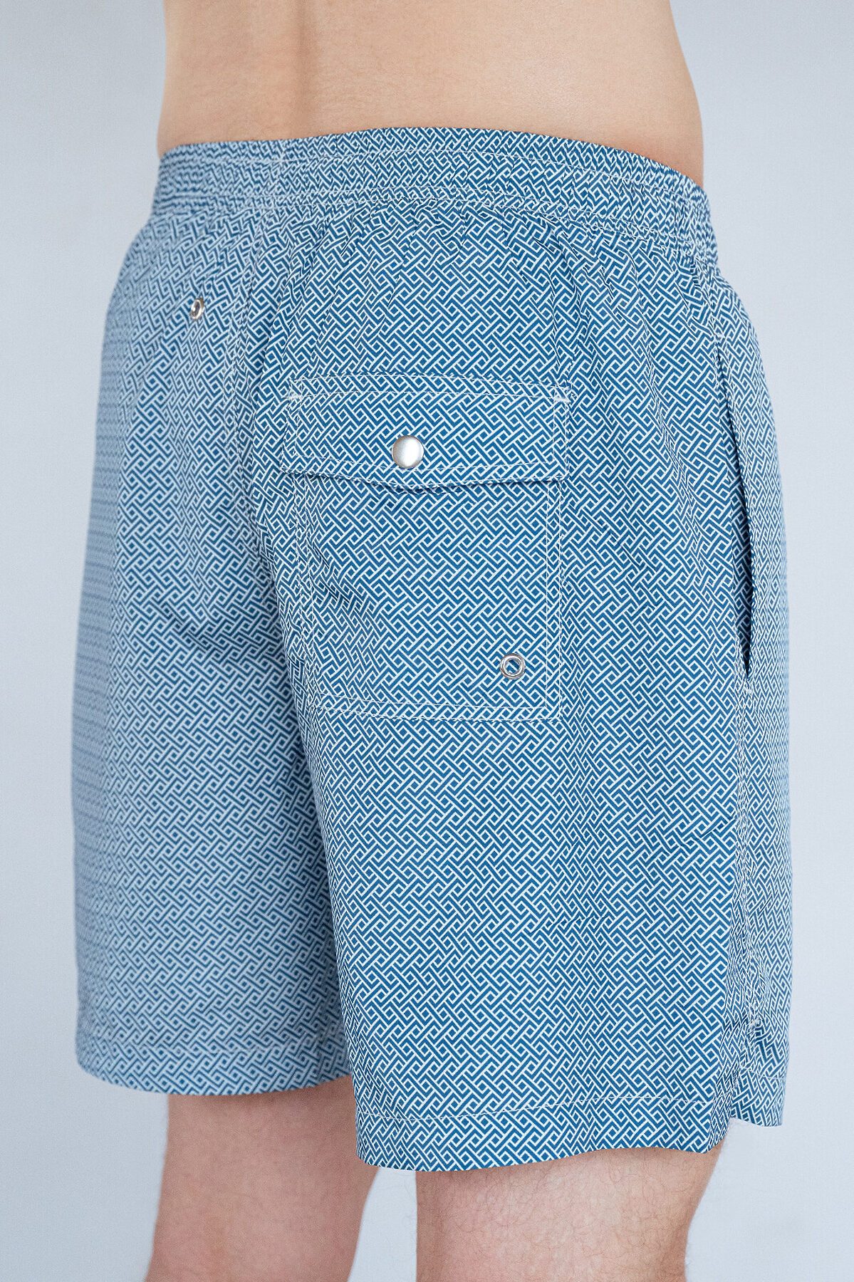 Шорты мужские пляжные, изготовленные из полиэстера, имеют широкую эластичную резинку на талии с регулирующим шнурком внутри. По бокам расположены два сетчатых кармана и один задний карман на заклёпке и с маленьким отверстием. На внутренней части шорт расположена сетчатая вставка с вырезами для ног, на задней части шорт имеются два отверстия. Шорты украшены геометрическим принтом.