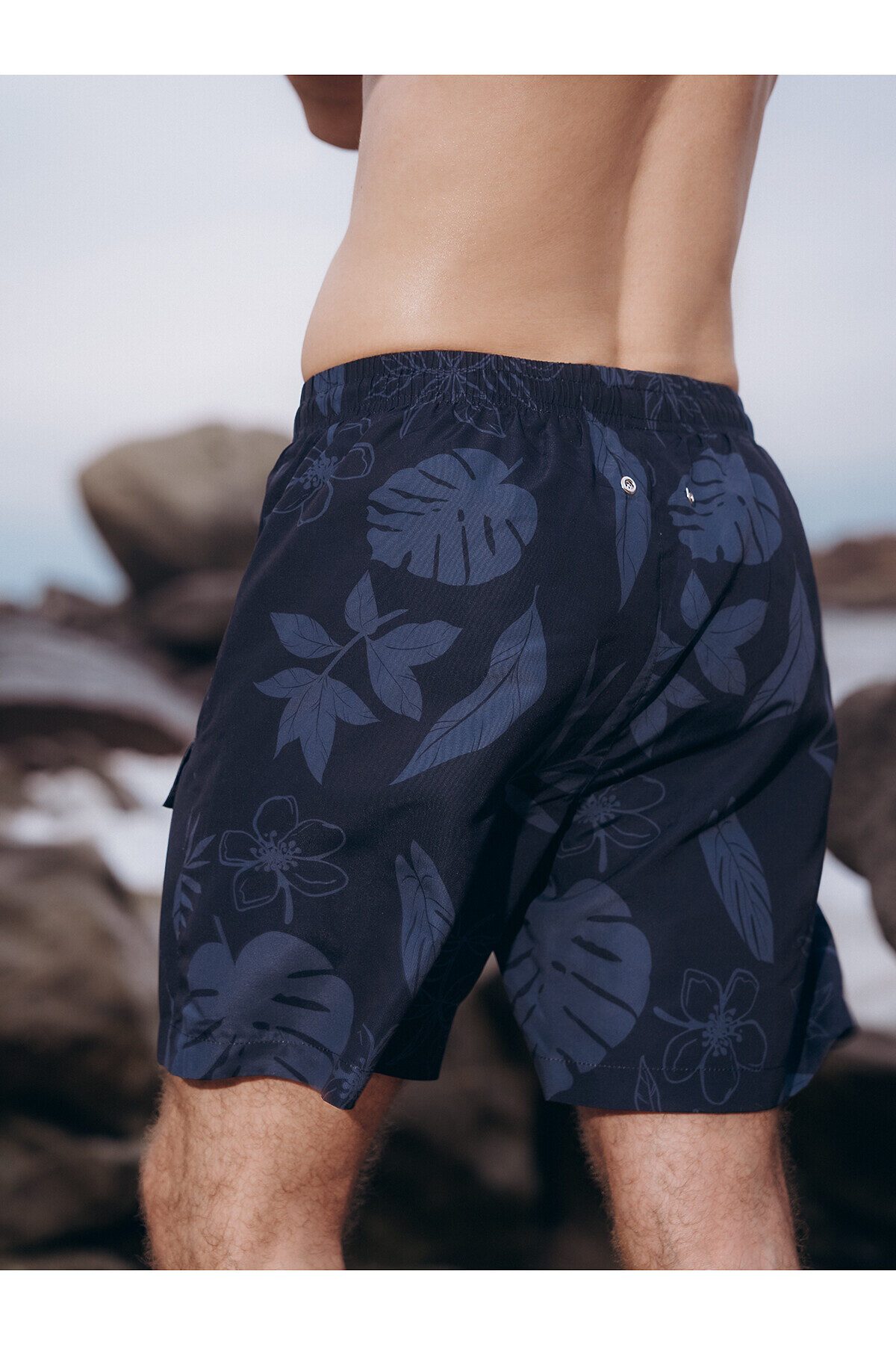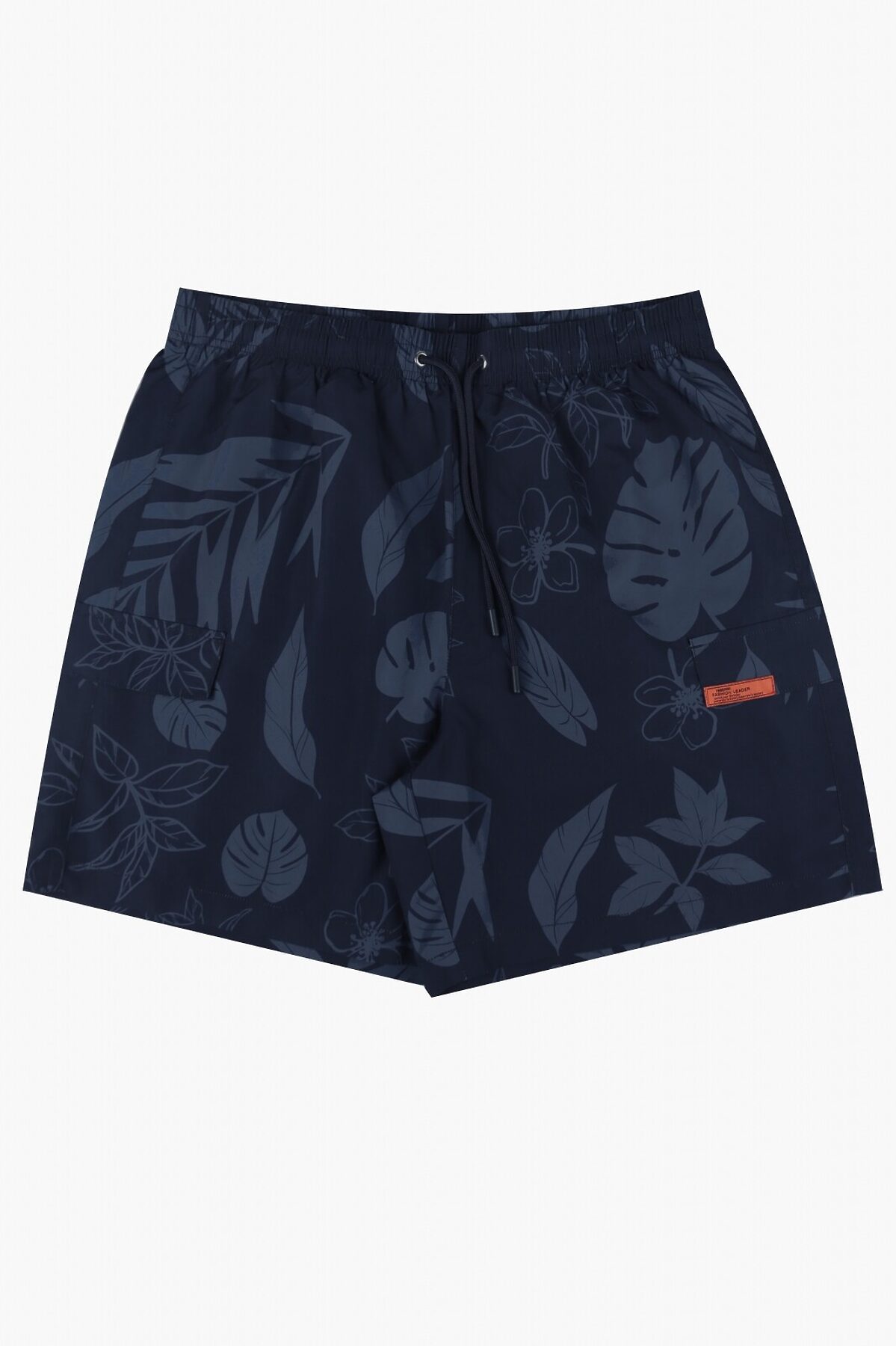 Шорты мужские пляжные, изготовленные из полиэстера, выполнены в темно-синем цвете. На талии имеется широкая эластичная резинка с регулирующим шнурком. Спереди с обеих сторон расположены два сетчатых кармана на липучках. На внутренней части шорт имеется сетка с вырезами для ног, на задней части шорт имеются два отверстия. Шорты украшены принтом с изображением листьев.