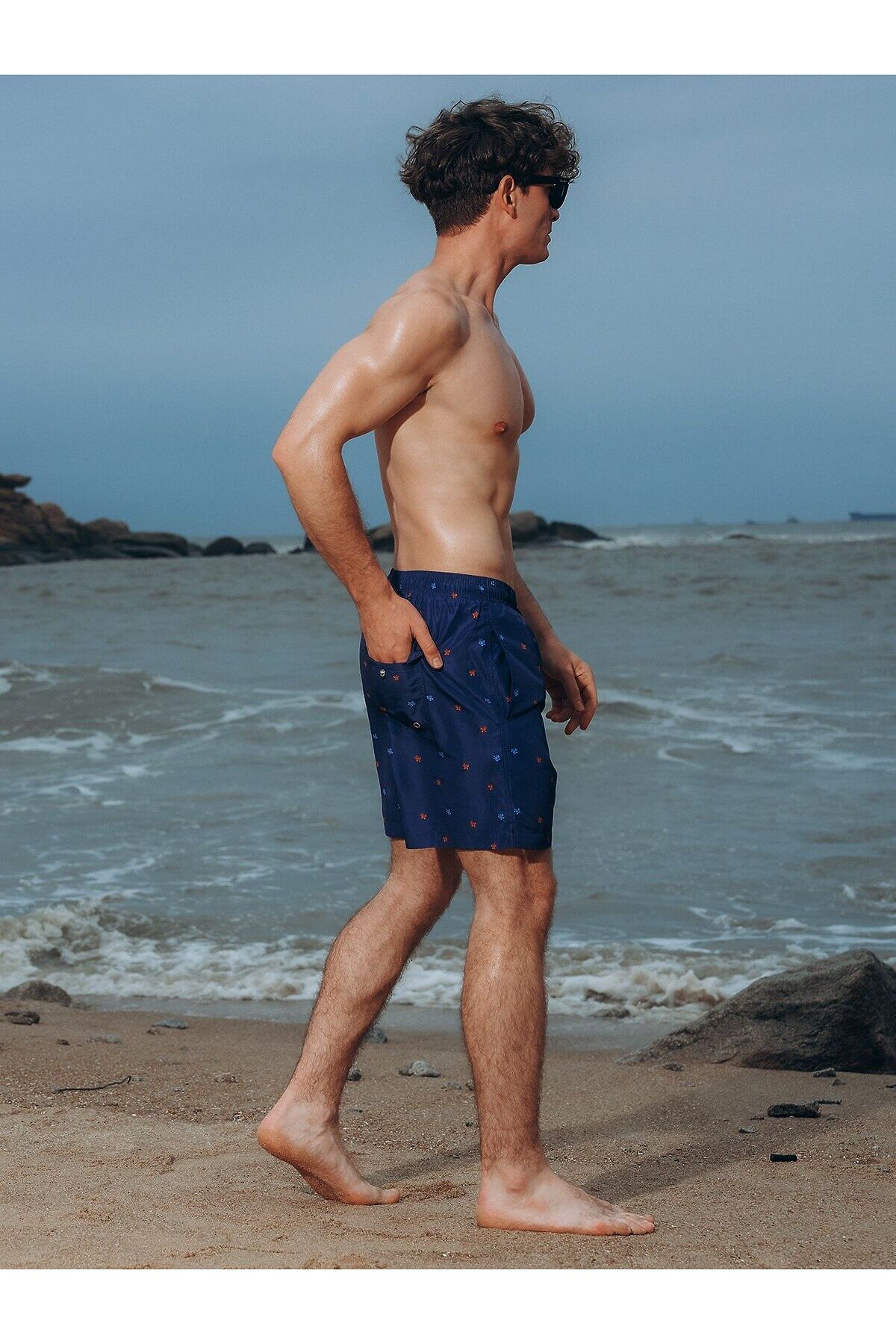 Шорты мужские пляжные 5020YMS бренда Indefini изготовлены из полиэстера. Выполнены в синем цвете с принтом с изображением черепашек. На талии имеется широкая эластичная резинка с регулирующим шнурком внутри. По бокам расположены два сетчатых кармана и один задний карман на заклёпке и с маленьким отверстием. На внутренней части шорт имеется сетка с вырезами для ног. На задней части шорт имеются два отверстия.