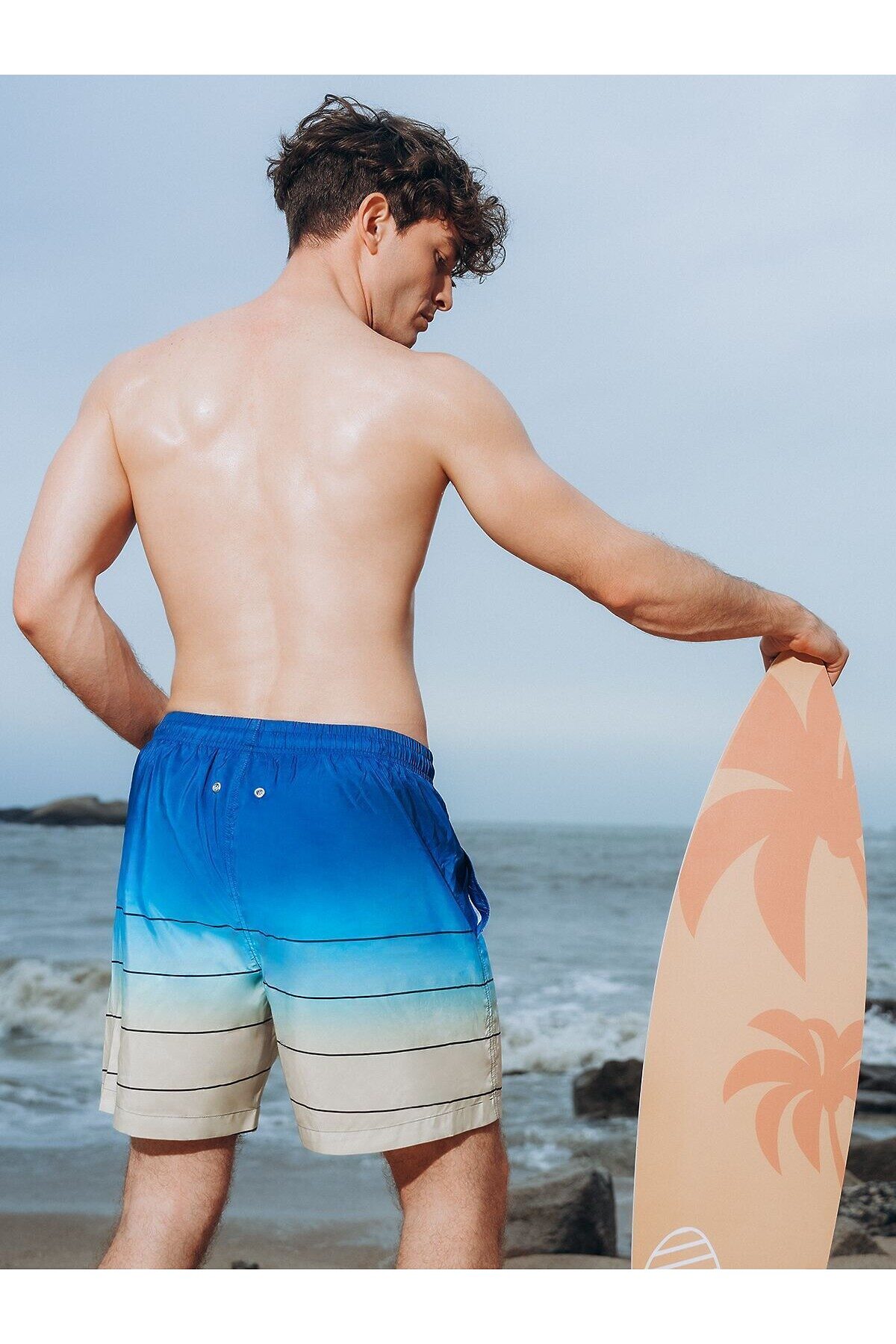 Шорты мужские пляжные, изготовленные из полиэстера, выполнены в цвете мультиколор. На талии имеется широкая эластичная резинка с регулирующим шнурком. По бокам расположены два сетчатых кармана. На внутренней части шорт имеется сетка с вырезами для ног, на задней части шорт расположены два отверстия. Нижняя часть шорт украшена принтом в синюю полоску.