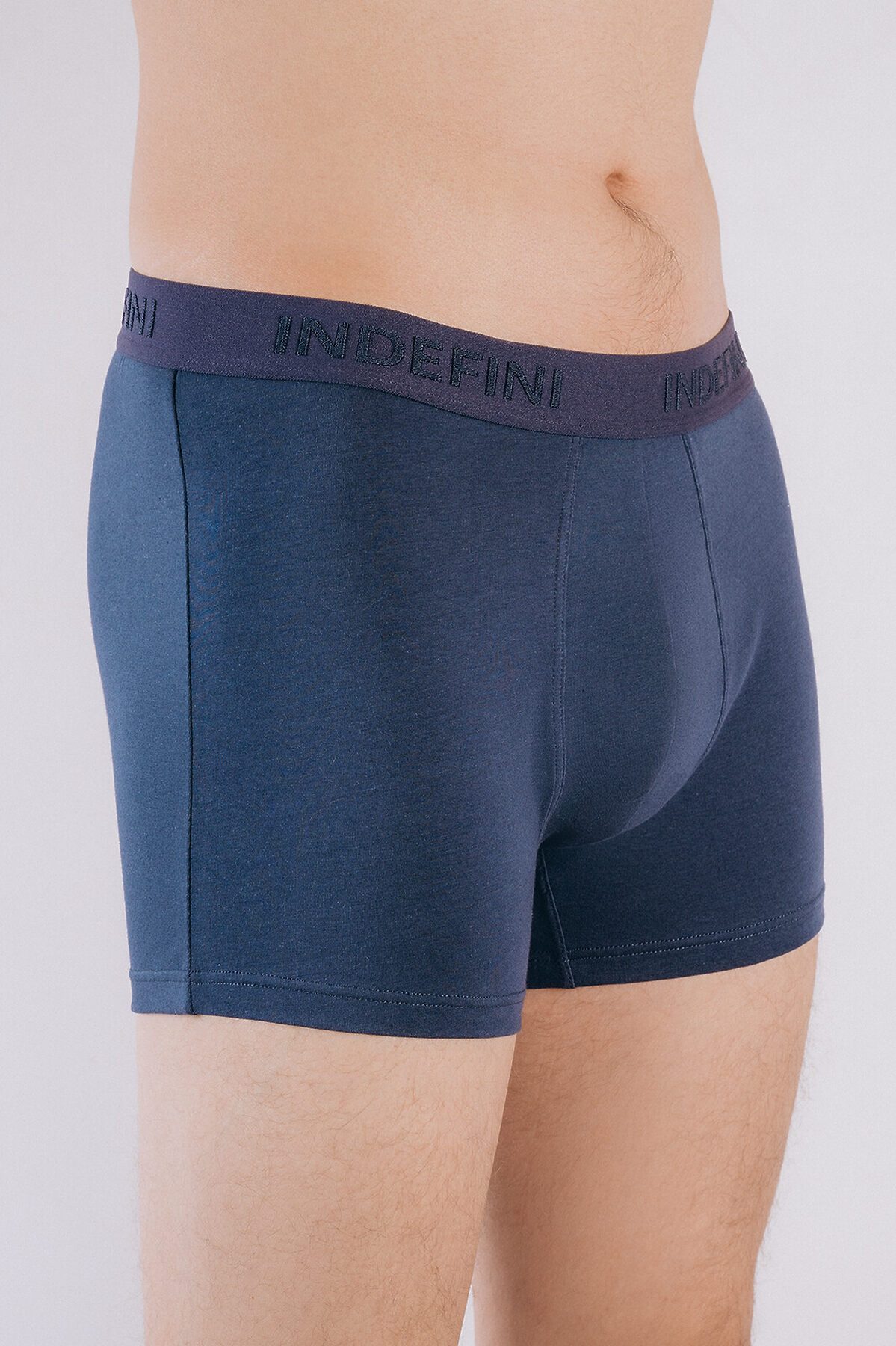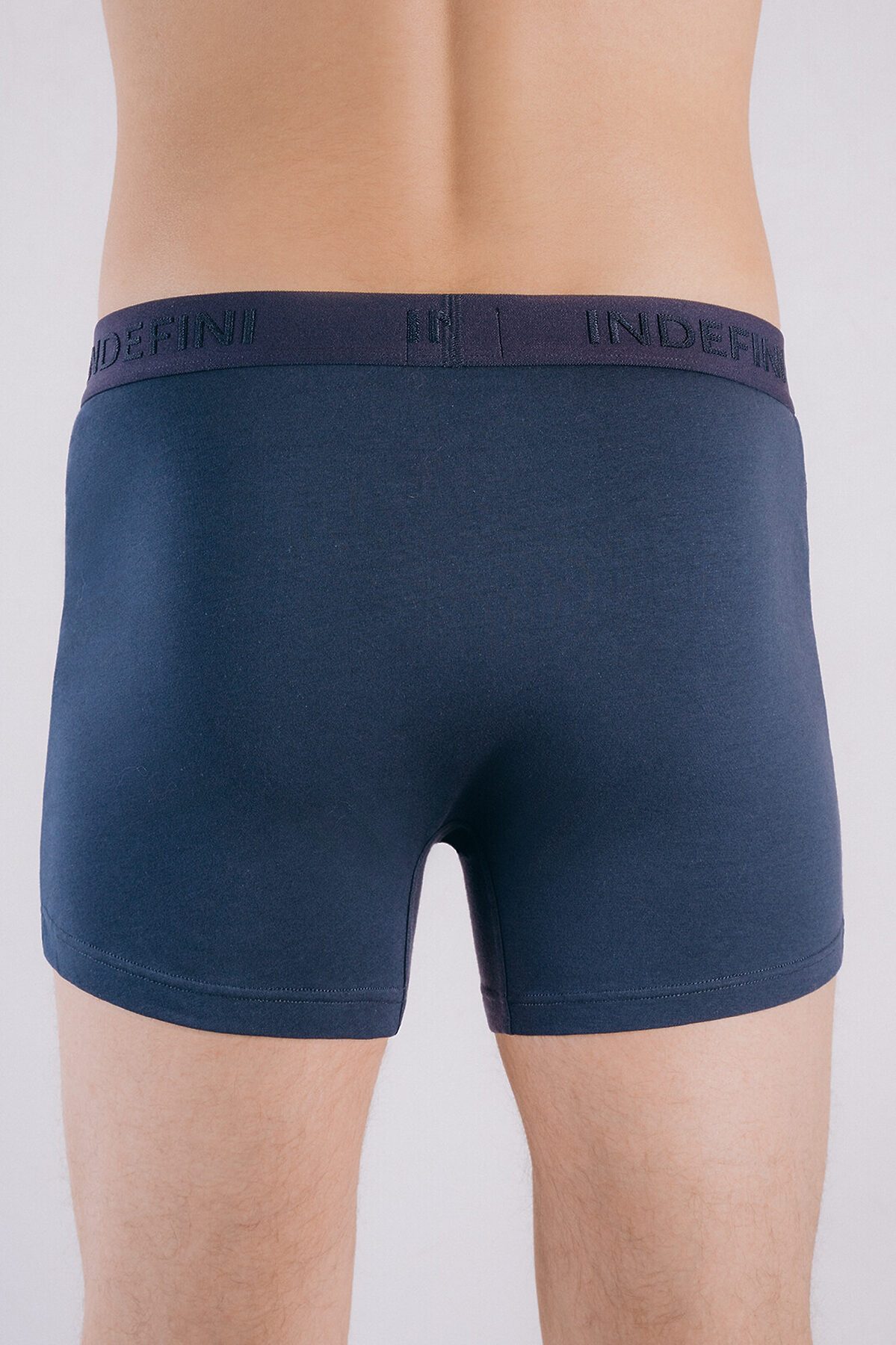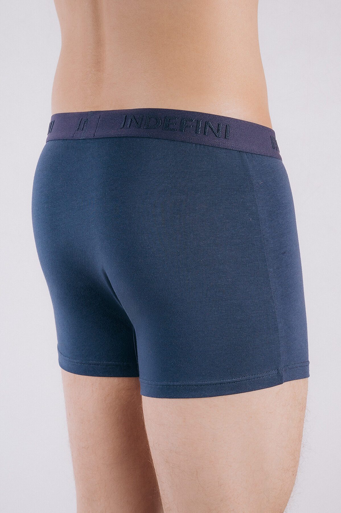 Мужские трусы изготовлены из хлопка, выполнены в синем цвете. Трусы боксеры средней посадки имеют широкую эластичную резинку на талии. Резинка украшена надписью «INDEFINI».